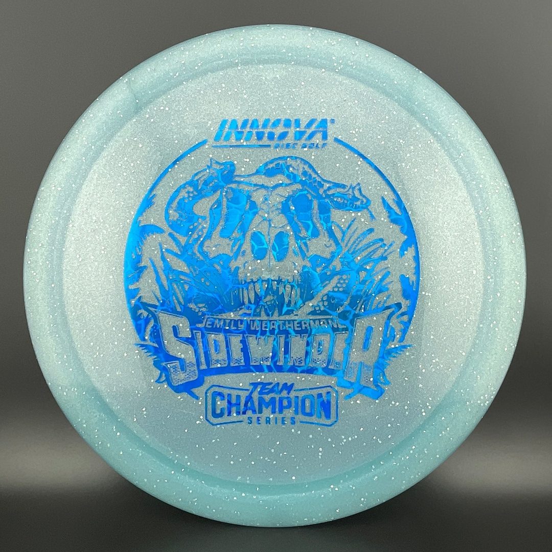 Welcome the 2024 FPO Rookie of the Year to Team Innova! Her new Moondust Champion Sidewinders sparkle as they snake through the sky. You won’t be able to stop staring at this slithering stamp that stares back.