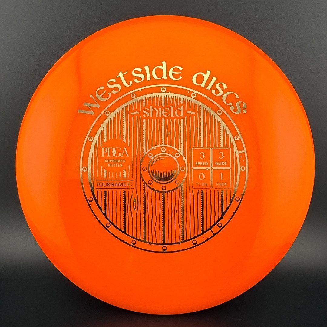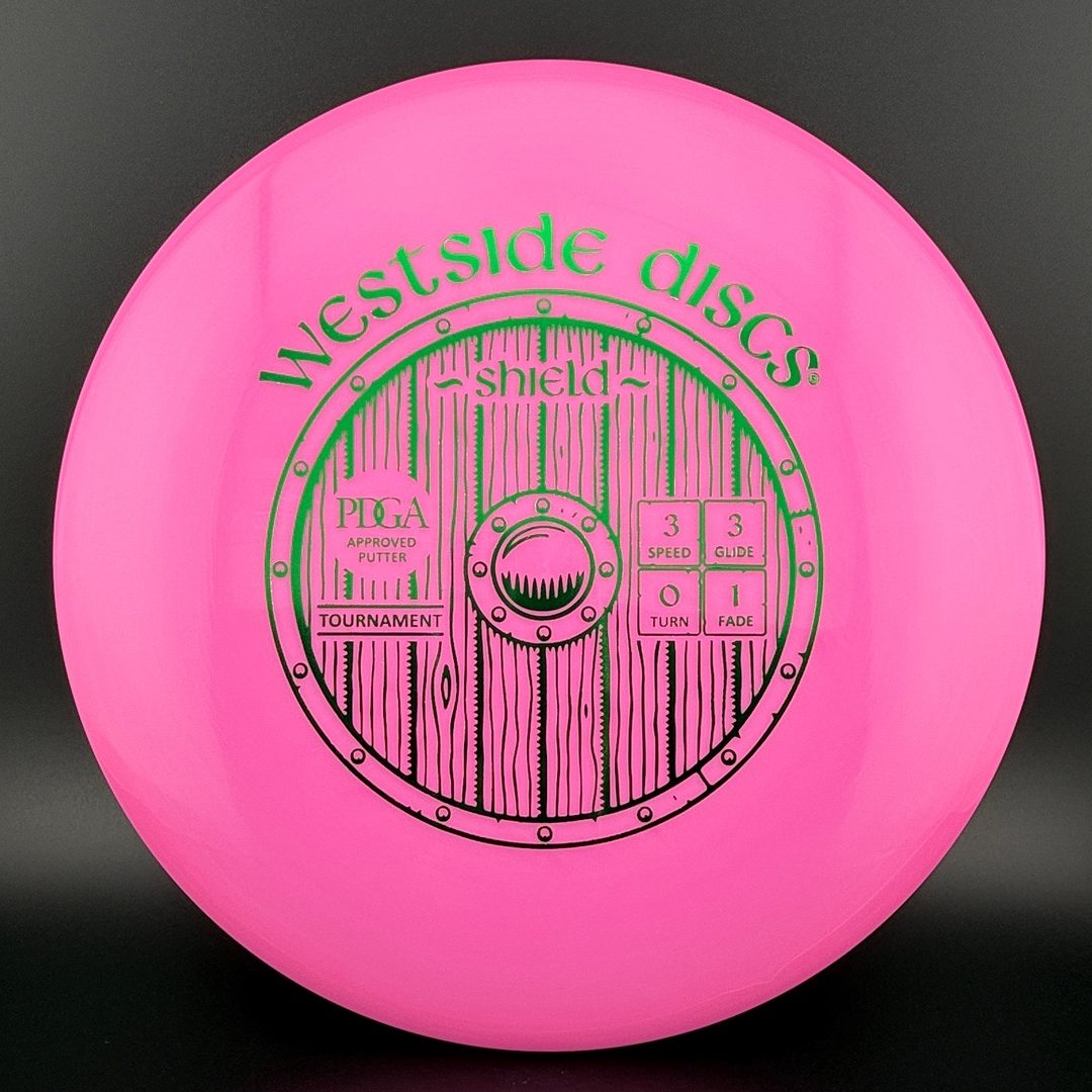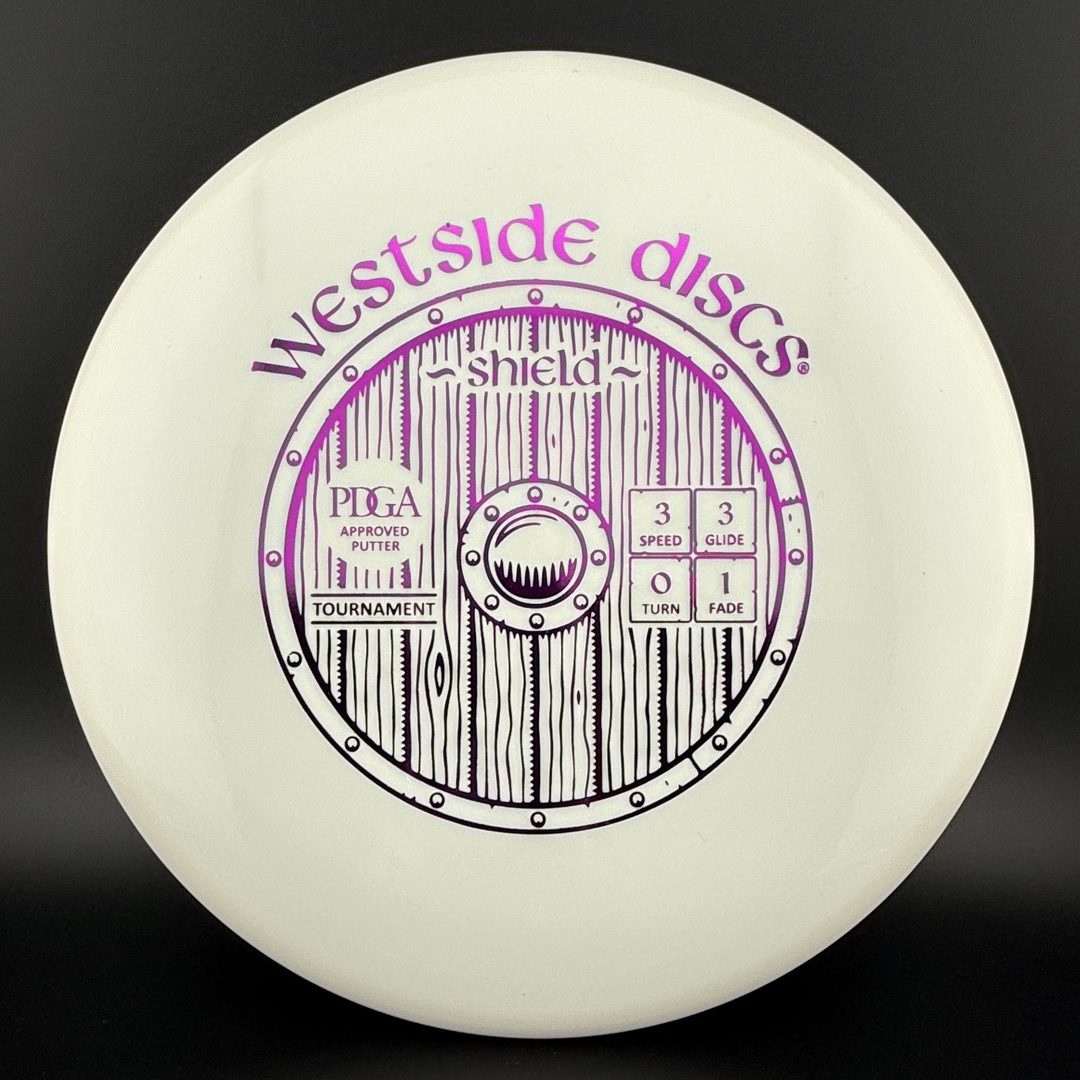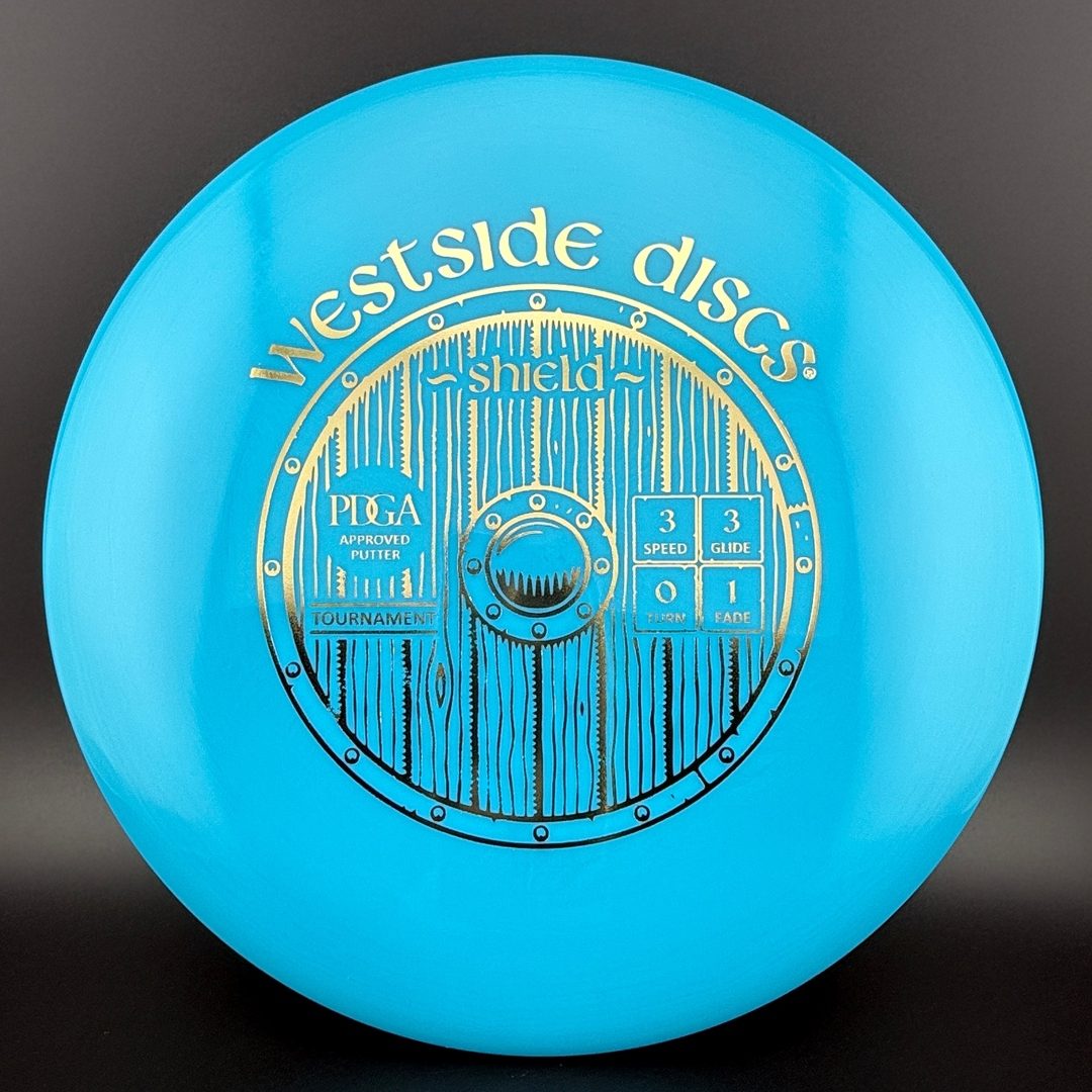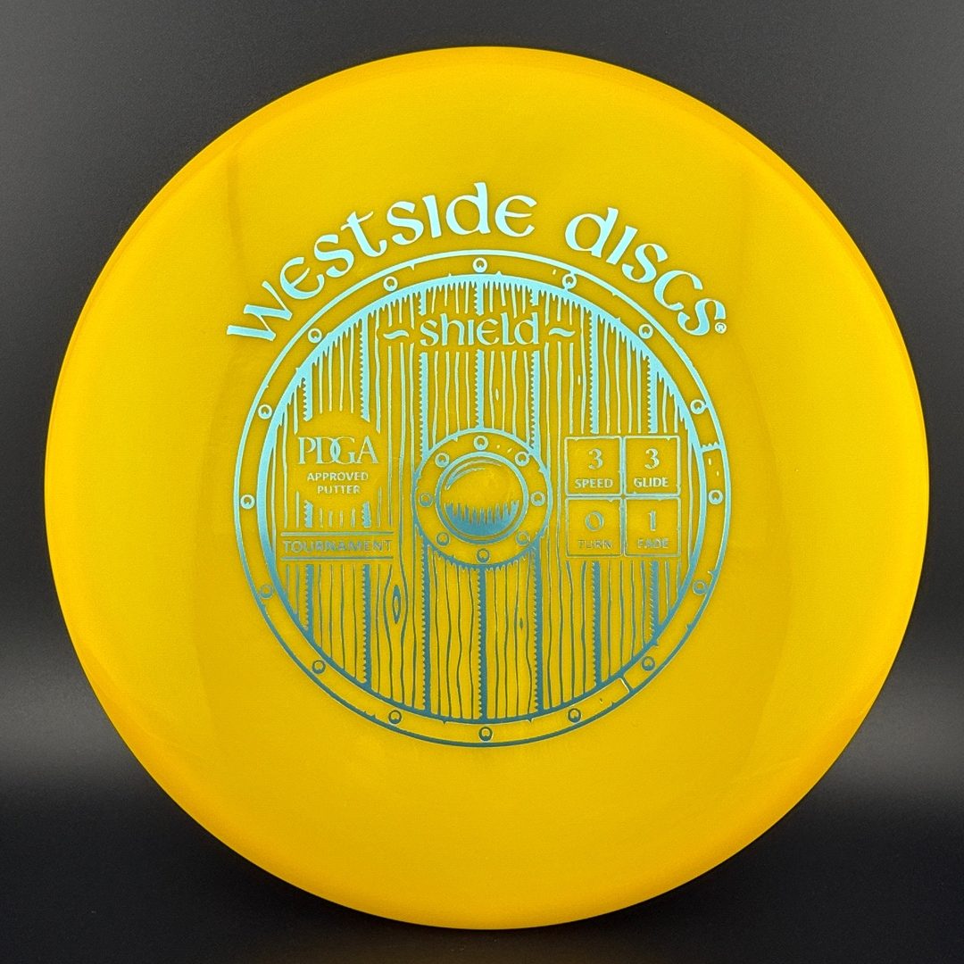 The Shield is the overstable Westside putter that was used as part of the 2014 Trilogy Challenge. This putt and approach disc is more stable than the Swan and a straighter flyer than the Westside Harp. This is a very tall disc at 2.5cm tall, and is relatively flat. Like all Westside putters, this new disc will be available in the BT plastic blends.