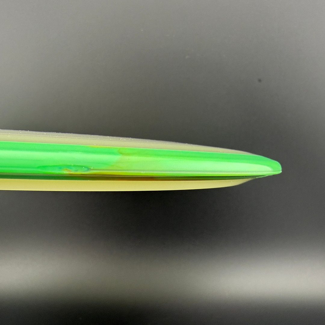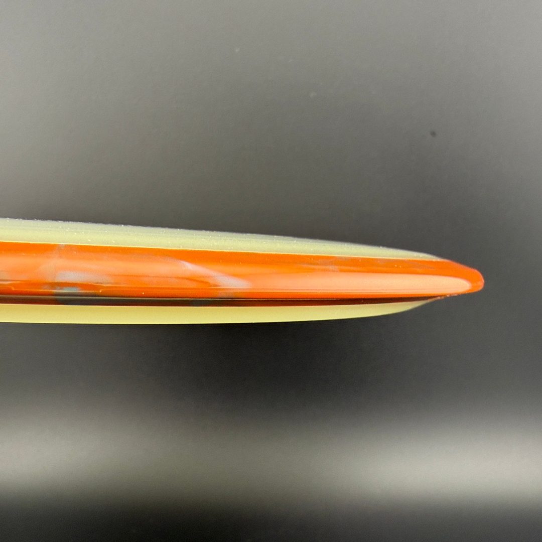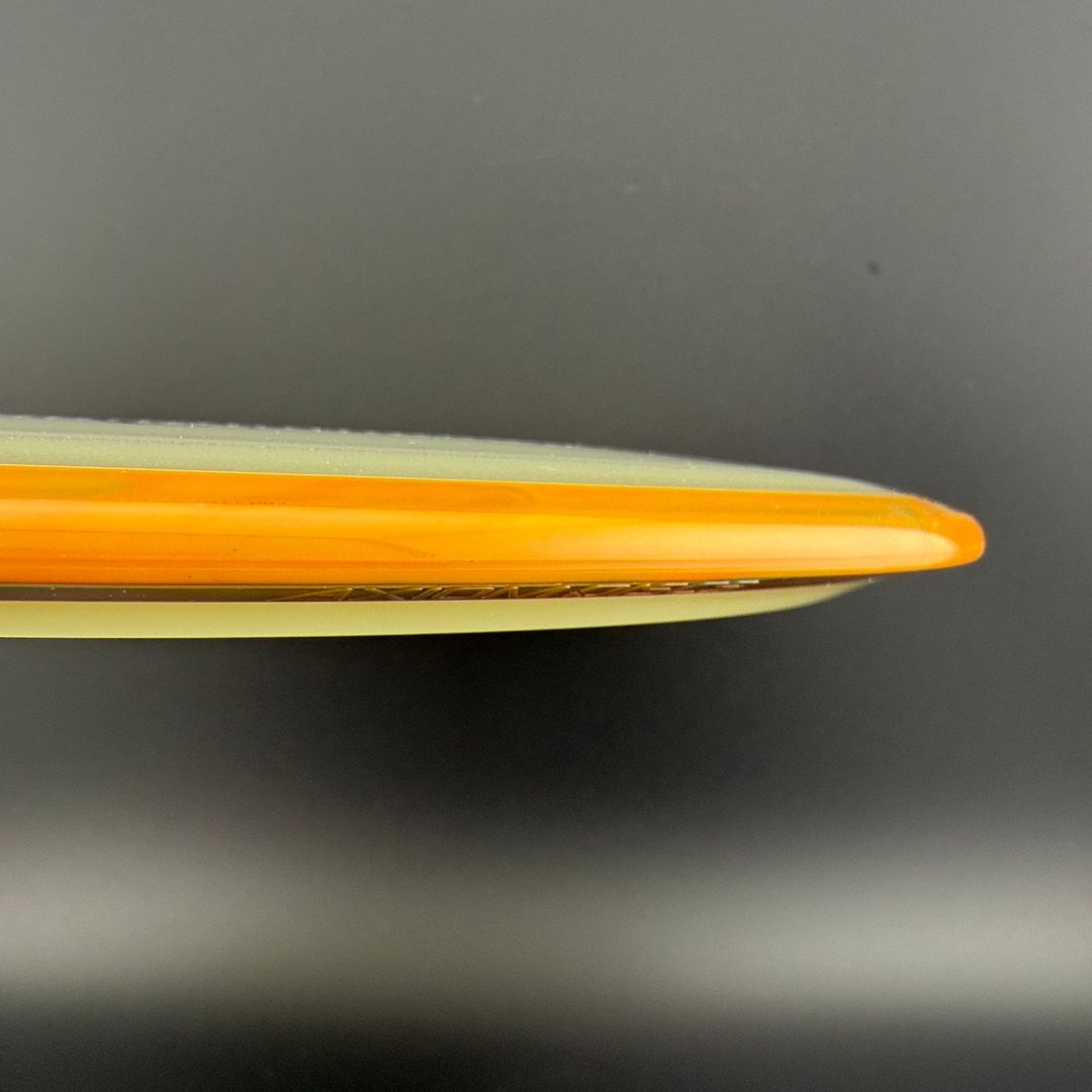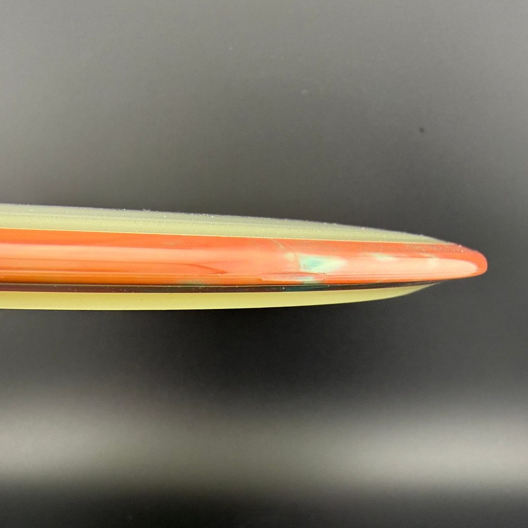 Particle-Eclipse is a striking glow-in-the-dark hybrid plastic by Axiom that embeds tiny, luminescent "particles" throughout the disc—but inside the clear Eclipse glow core, not just in the rim. This blend offers the same bright, long-lasting glow and robust durability of traditional Eclipse, paired with a unique, speckled finish visible in low-light and daylight. The feel remains firm and reliable, delivering consistent overmold stability within a glowing core that really stands out in glow rounds—and in the bag.