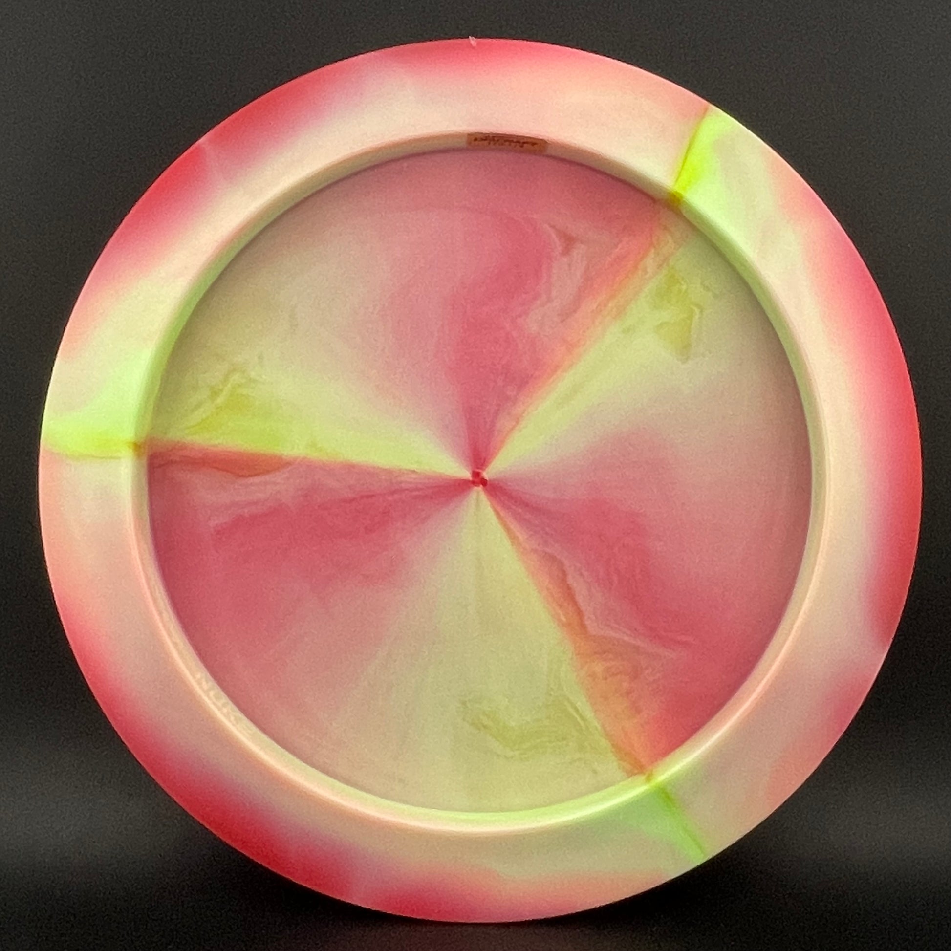The Nuke has been dominating courses around the globe since 2009 and has become one of the most popular distance drivers in the world. This high-speed driver sports a thick, wide rim and holds its overstability even for power throwers. It is a popular choice for both forehand and backhand shots. Discraft’s second-to-none swirl game in the ESP plastic is once again a masterpiece in this run. A tacky feel and a small flexibility within the flight plate make these Nukes a nice pickup for Discraft players with power. The stamp shows an open-mouthed skull carrying the word “Nuke” in its teeth with a backwards “N”. This was part of a run of 1000 discs.