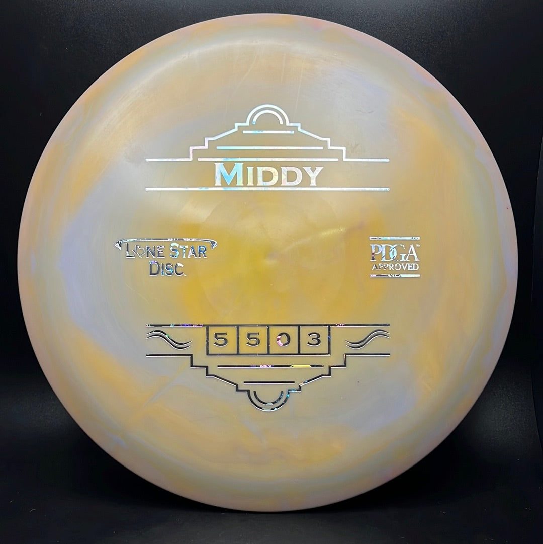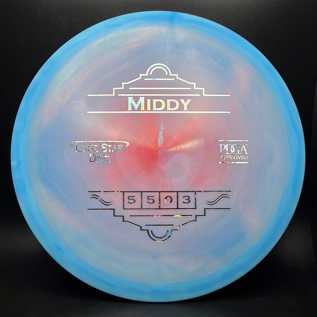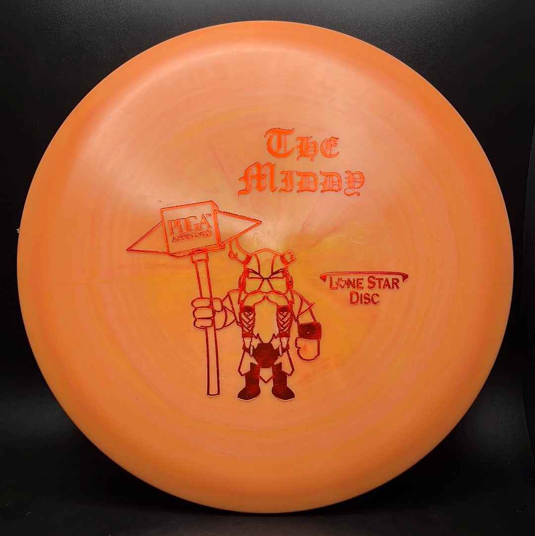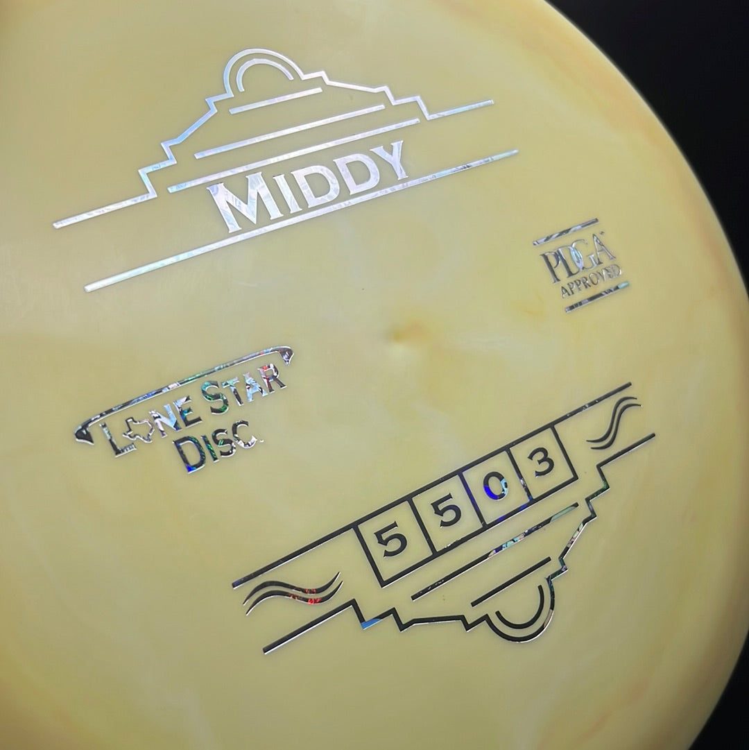 The Middy will be your new go-to midrange. It has a classic straight midrange flight with a nice bite at the end. It's the perfect, reliable mid from Lone Star Disc.