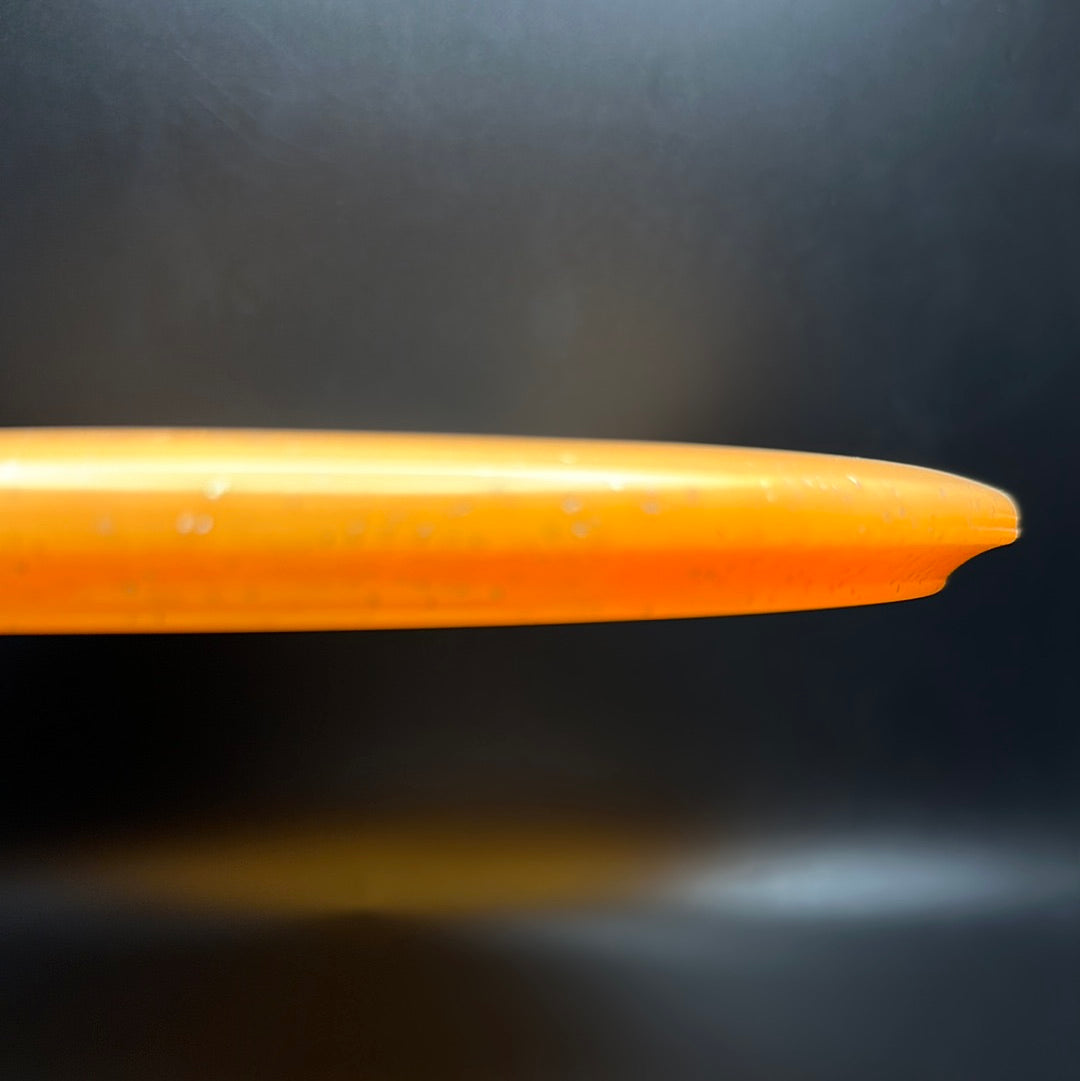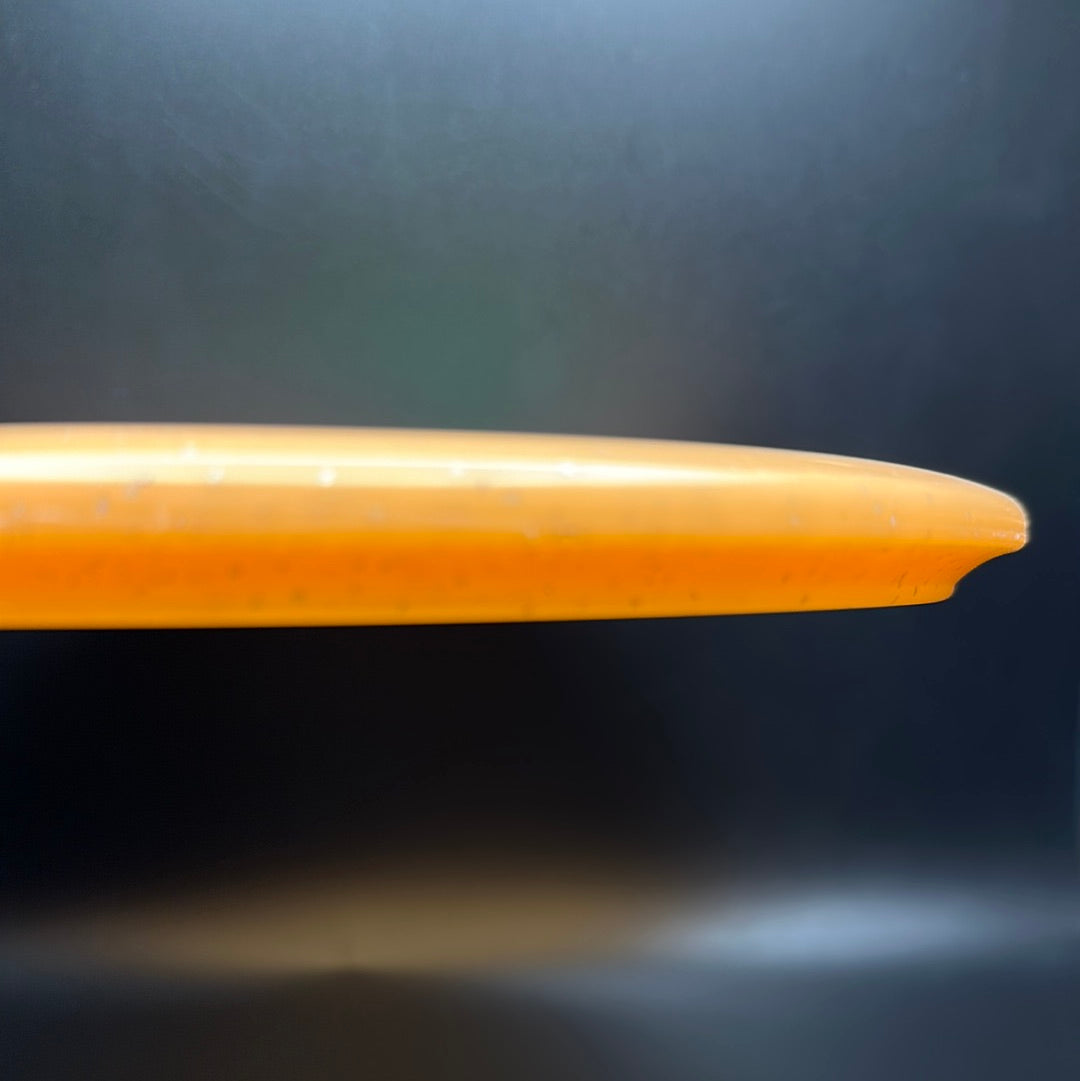 This is a Metal Flake glow-in-the-dark version of C-Blend plastic, which is the equivalent of Innova's Champion plastic. It is a semi-transparent, durable plastic that provides outstanding performance and long life. The Glow C-Blend can be either colored or traditional white glow and often feels slightly more gummy than typical C-Blend plastic.