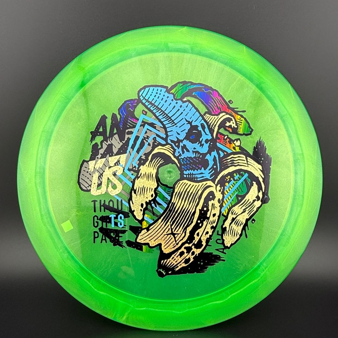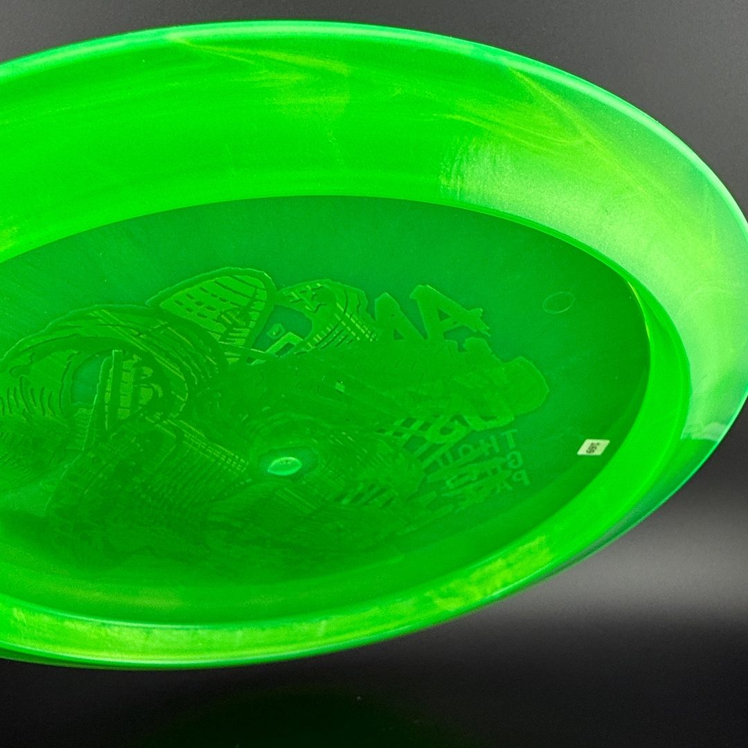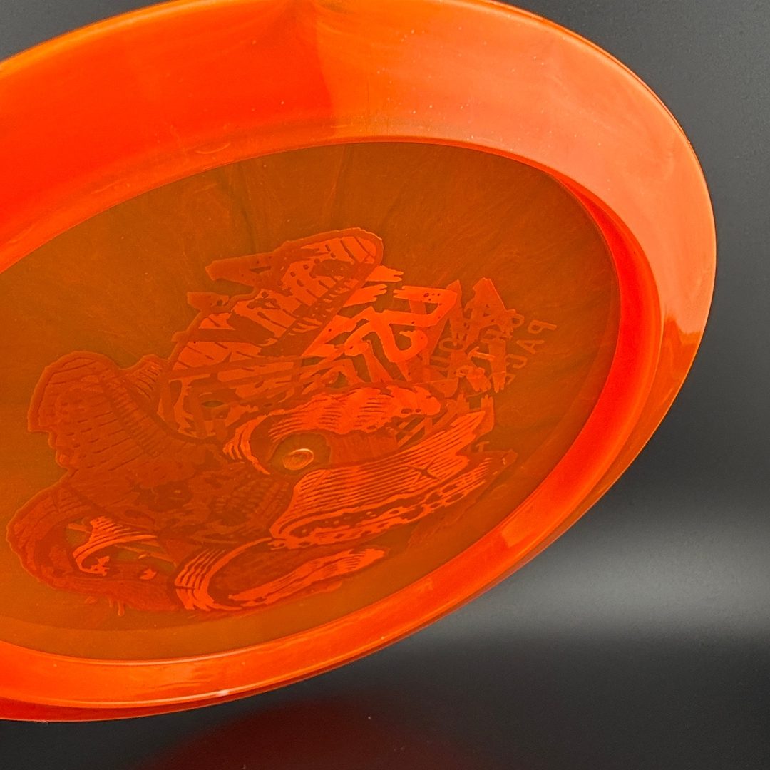 Ethos plastic from Thought Space Athletics is a premium blend and their most durable. It's see through and also the most overstable right out of the box. Plan on keeping this disc around for a long time because it will take a long time to break in and become flippy. Ethos is perfect for the Bananimus because you're going to hit obstacles at high speed and you want a disc that will retain its flight characteristics for a number of years.