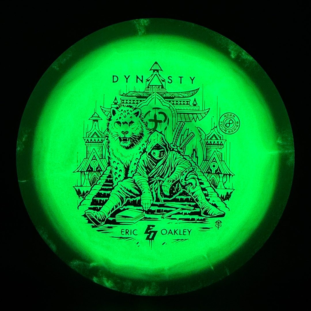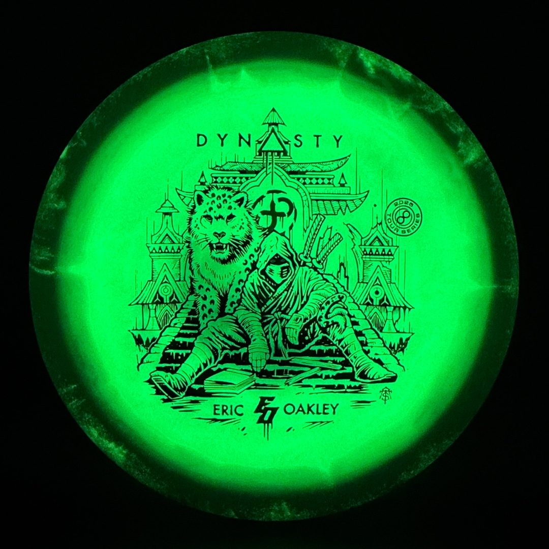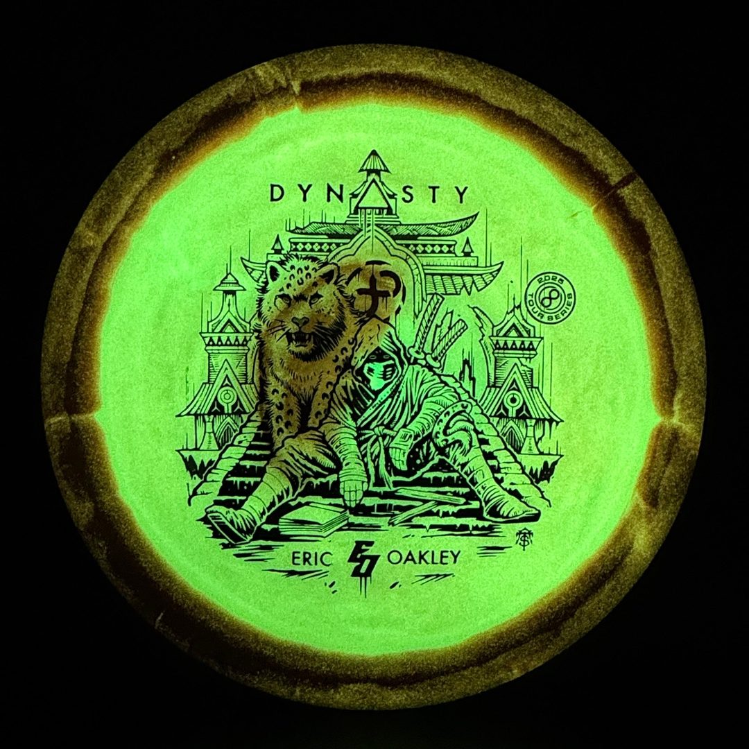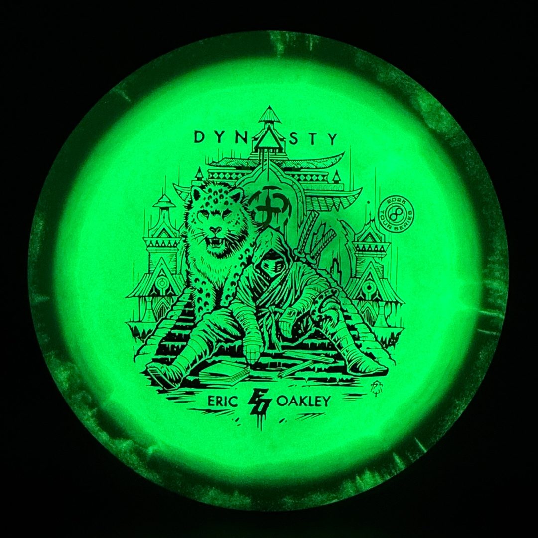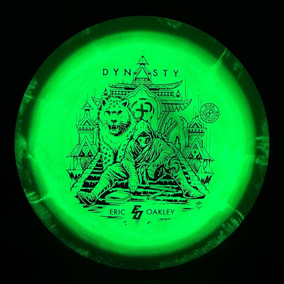 9/5/-1/2      *The first run of Halo C-Blend Glow Dynasties for Eric Oakley's 2025 Tour Series!   *These have a little bit of domeyness compared to past dynasties.  *Staff favorite.   *Storage wear is possible with this type of plastic. *Minor swirl differences possible, multiple available.