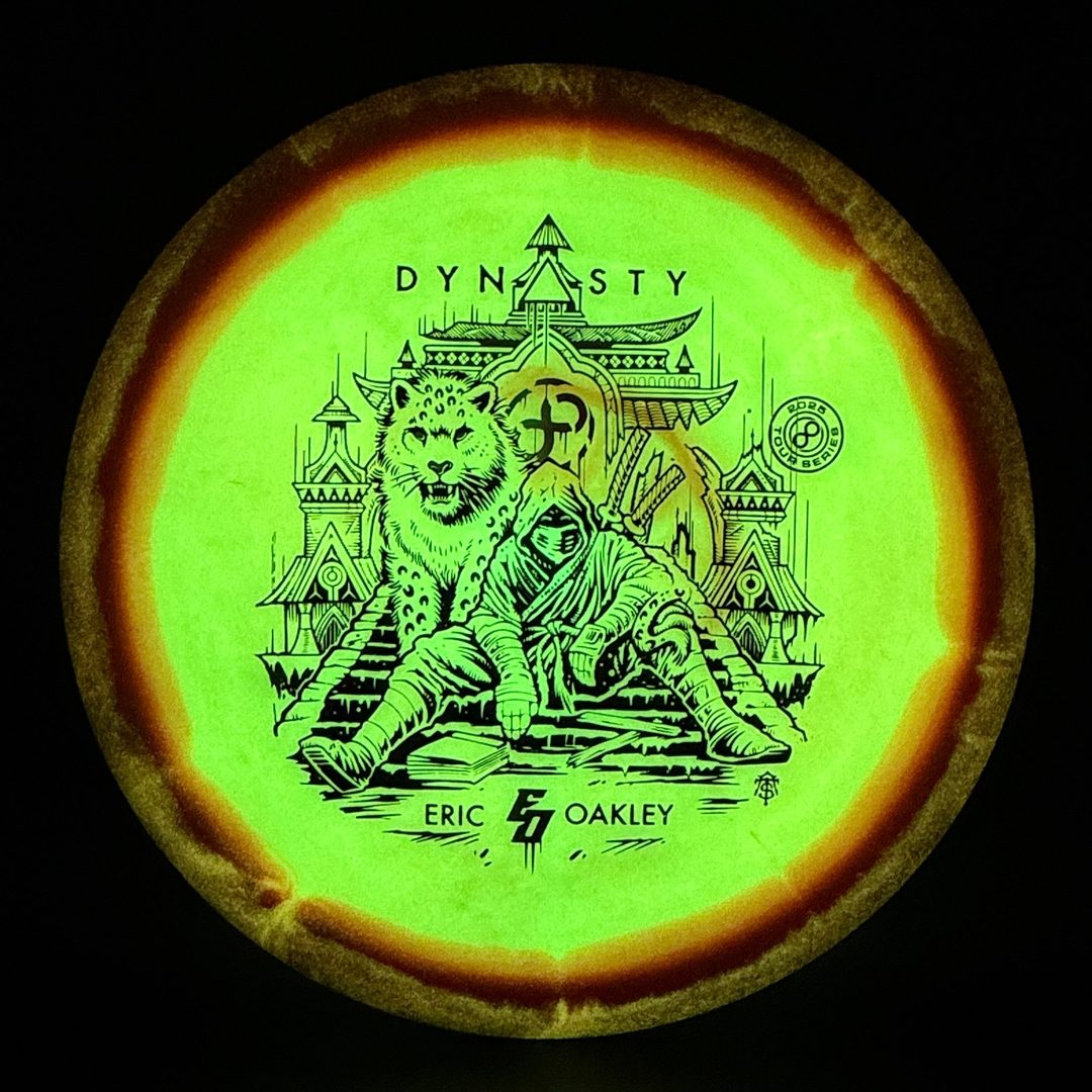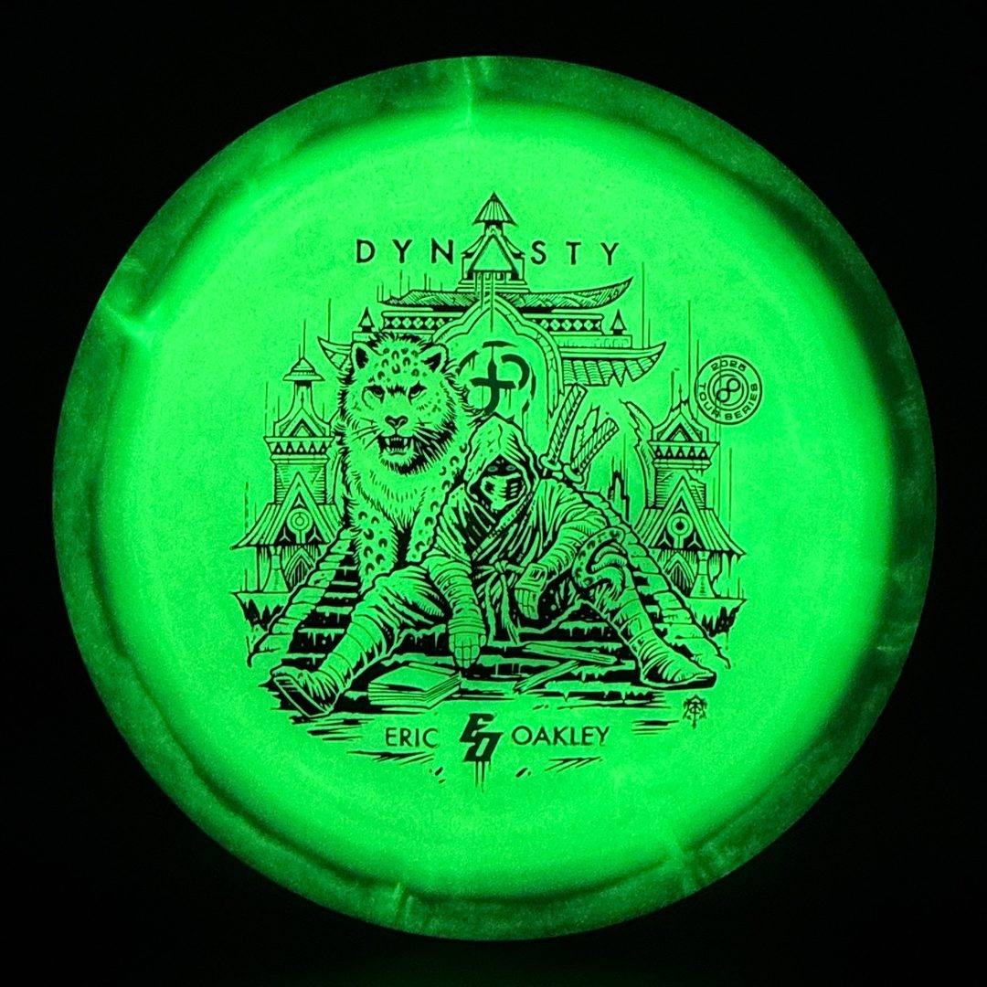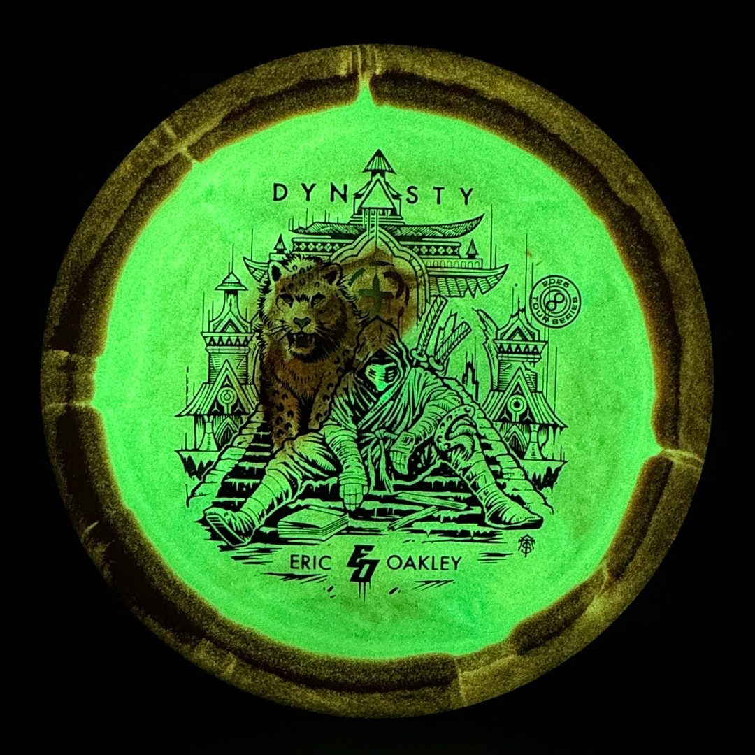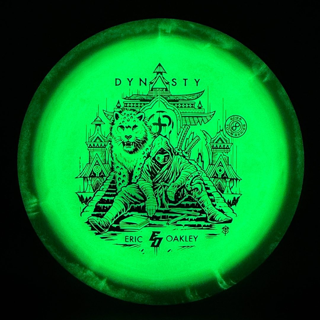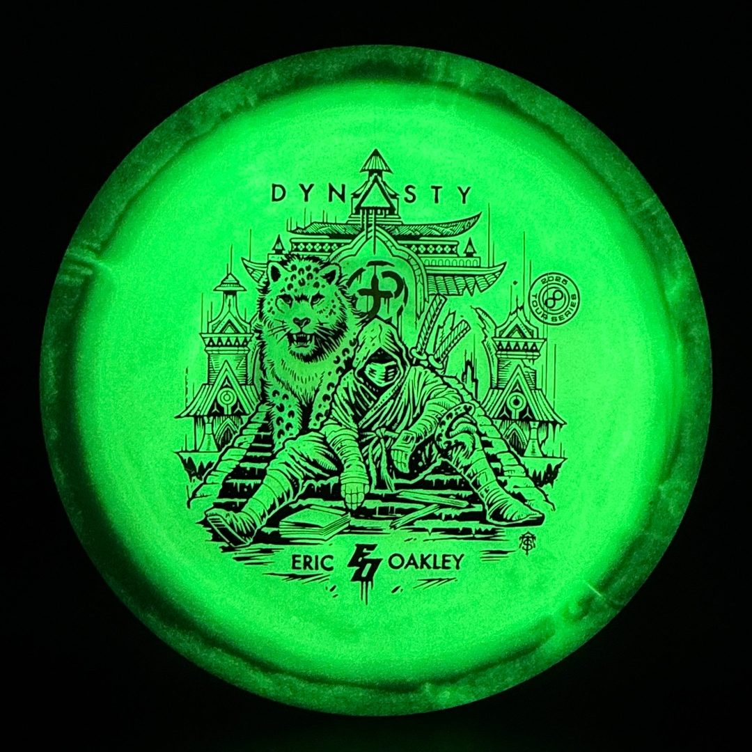 9/5/-1/2      *The first run of Halo C-Blend Glow Dynasties for Eric Oakley's 2025 Tour Series!   *These have a little bit of domeyness compared to past dynasties.  *Staff favorite.   *Storage wear is possible with this type of plastic. *Minor swirl differences possible, multiple available.