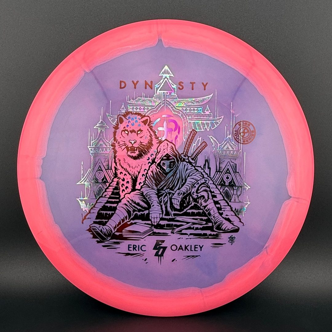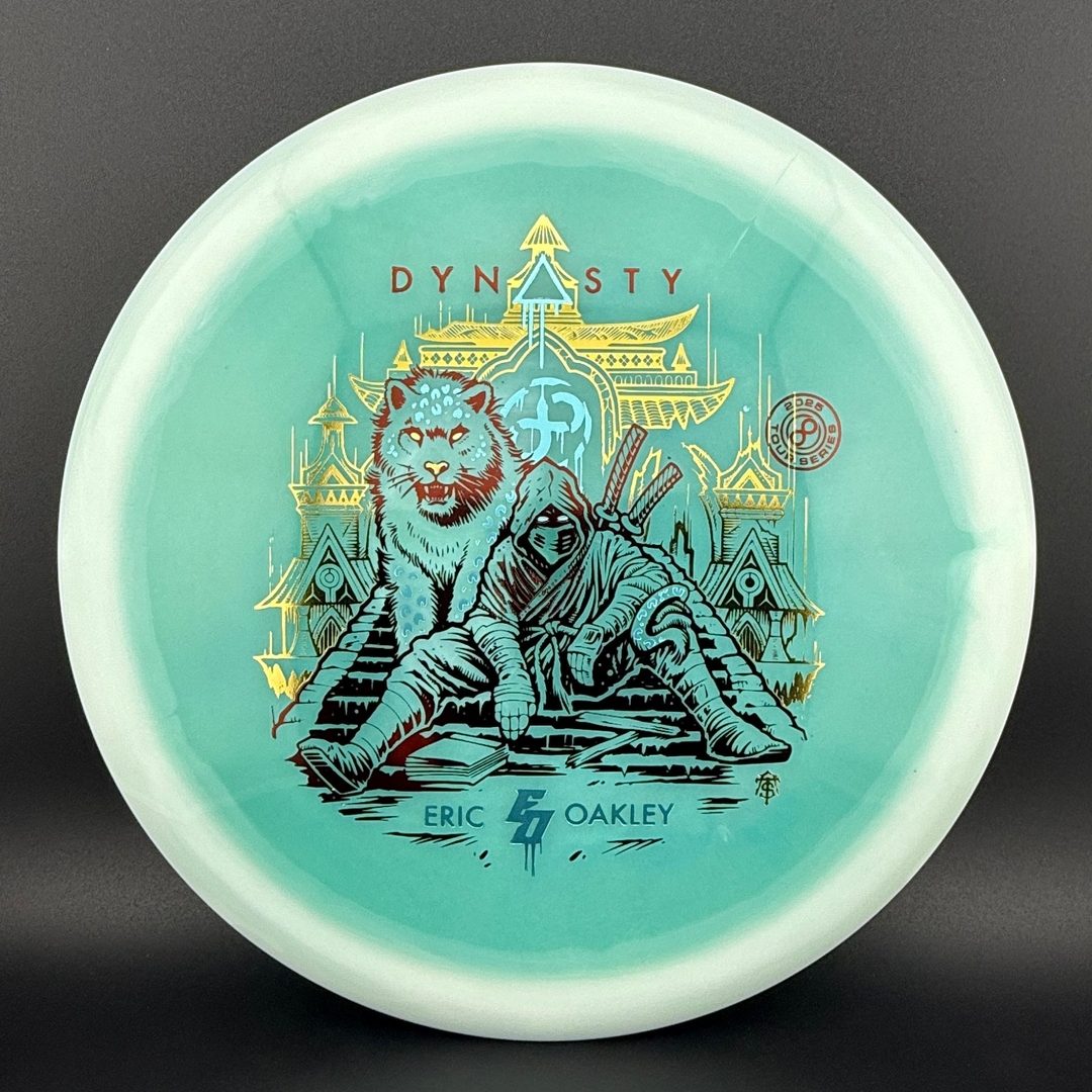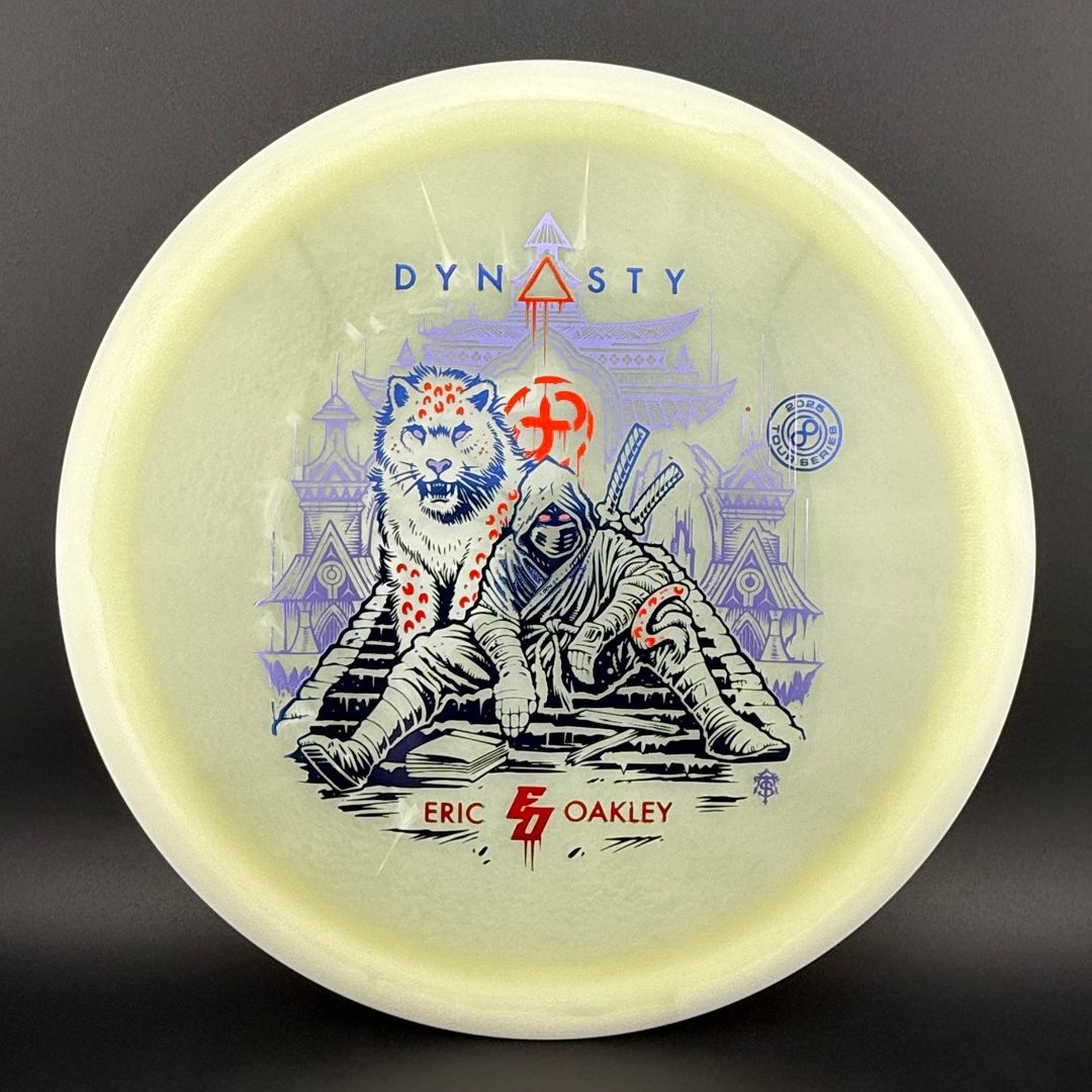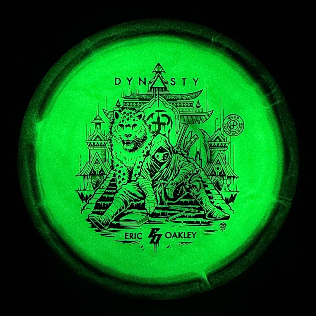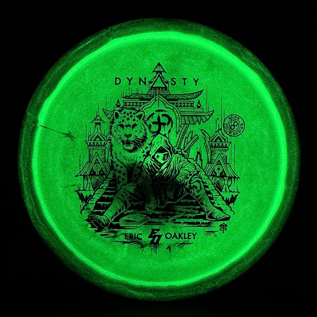 9/5/-1/2      *The first run of Halo C-Blend Glow Dynasties for Eric Oakley's 2025 Tour Series!   *These have a little bit of domeyness compared to past dynasties.  *Staff favorite.   *Storage wear is possible with this type of plastic. *Minor swirl differences possible, multiple available.