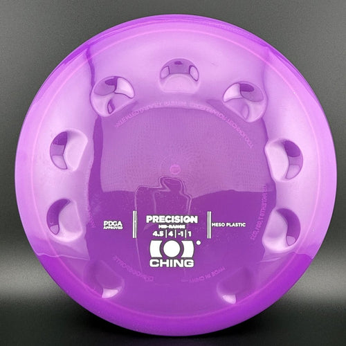 Ching Sports makes a complete set of disc golf discs. They offer a very overstable distance driver for advanced players (Genesis), stable flying fairway driver (Velocity), three midrange discs (Legacy, Oracle, Precision), and a stable flying putter (Juju). The unique thing about Ching discs are the Excelerator contours. Ching golf discs have indented contours that provide thumb grips for better control. These contours are staggered throughout the disc so that every player can find the perfect groove for their individual grip.