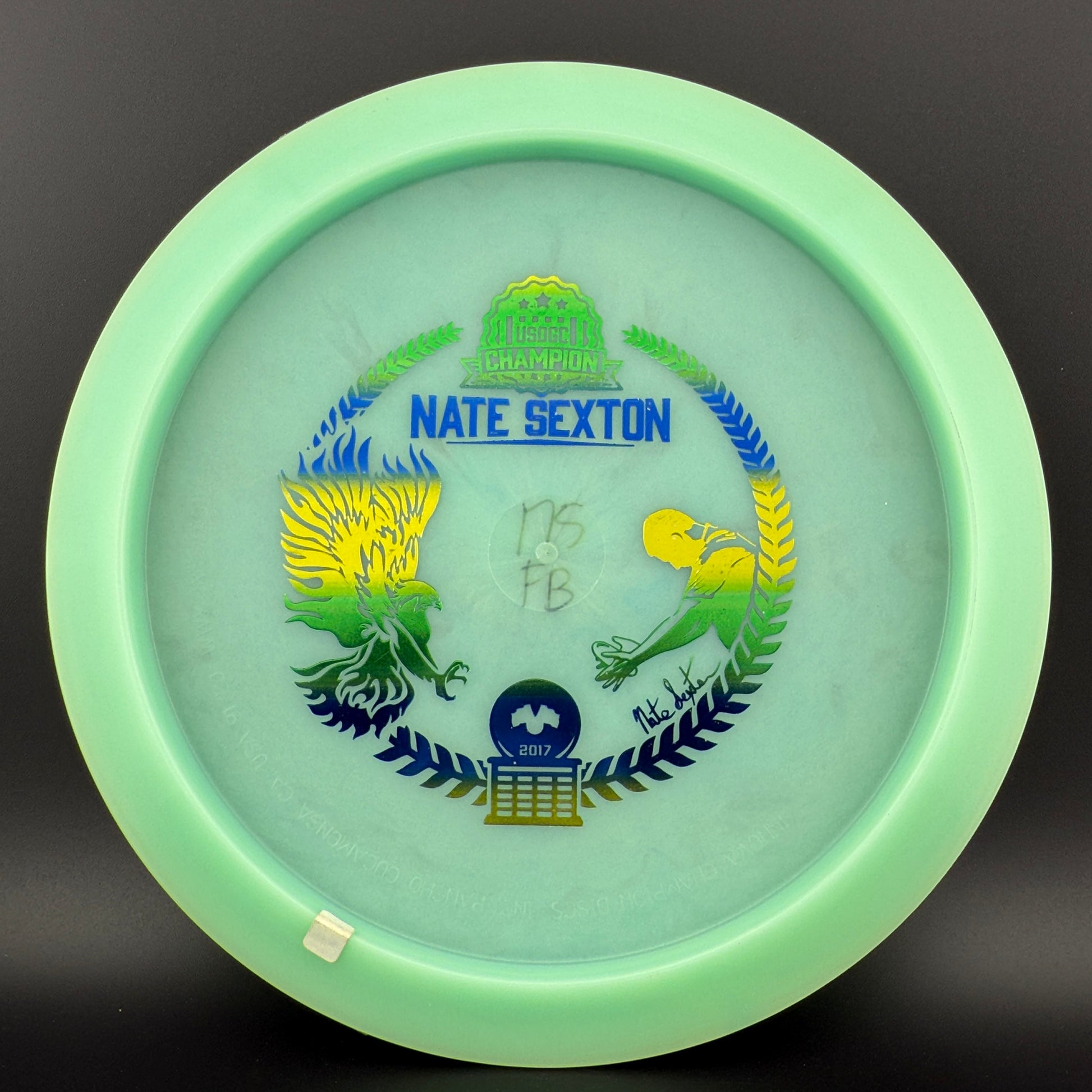 The 2017 Nate Sexton Tour Series Color Glow Firebird was a standout release that quickly became a favorite among disc golfers. Made from Innova’s Color Glow Champion plastic, this disc offered a perfect blend of grip, durability, and a softer feel compared to traditional Firebirds. The flight characteristics featured a reliable overstability, making it a go-to for forehand shots, skip shots, and windy conditions. The moderate dome provided extra glide compared to some other Firebird runs, while still maintaining a strong fade at the end. This disc became highly sought after, setting the stage for future Sexton Firebird releases.