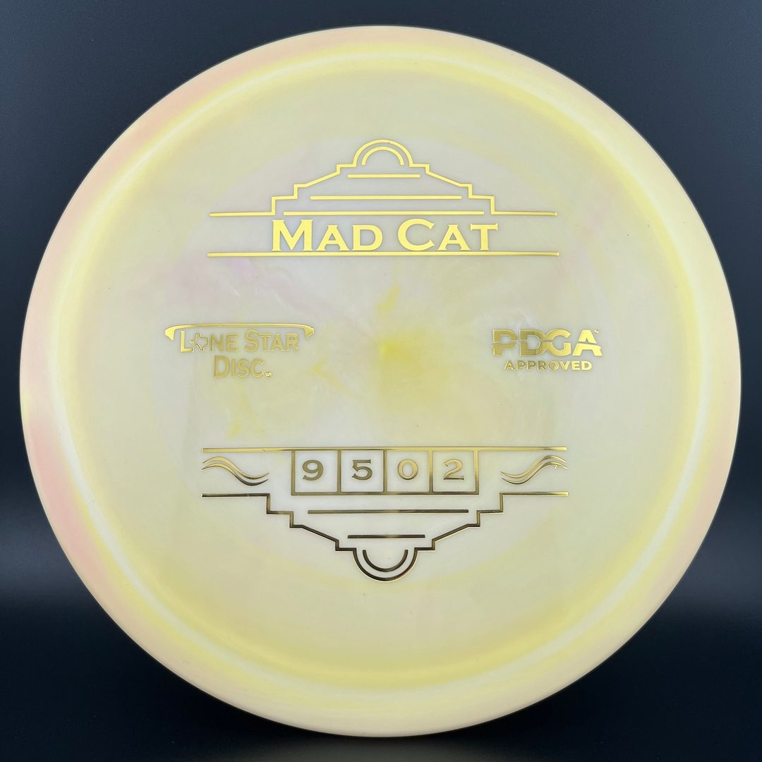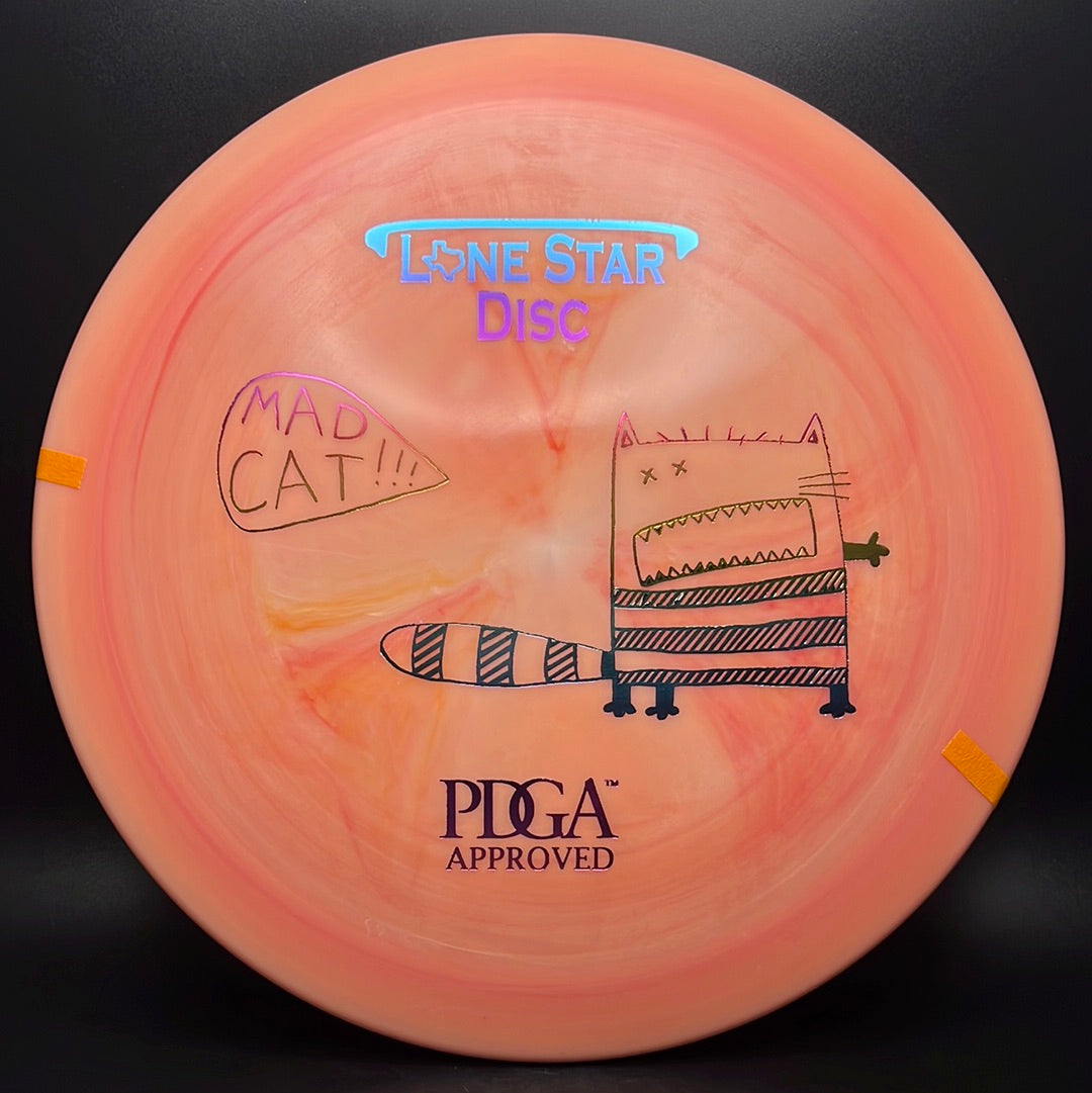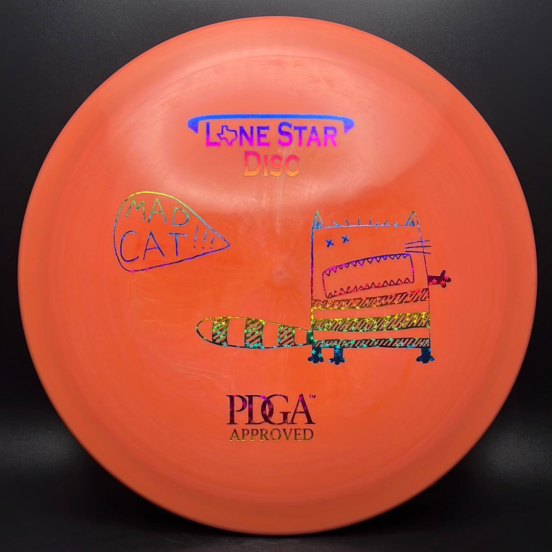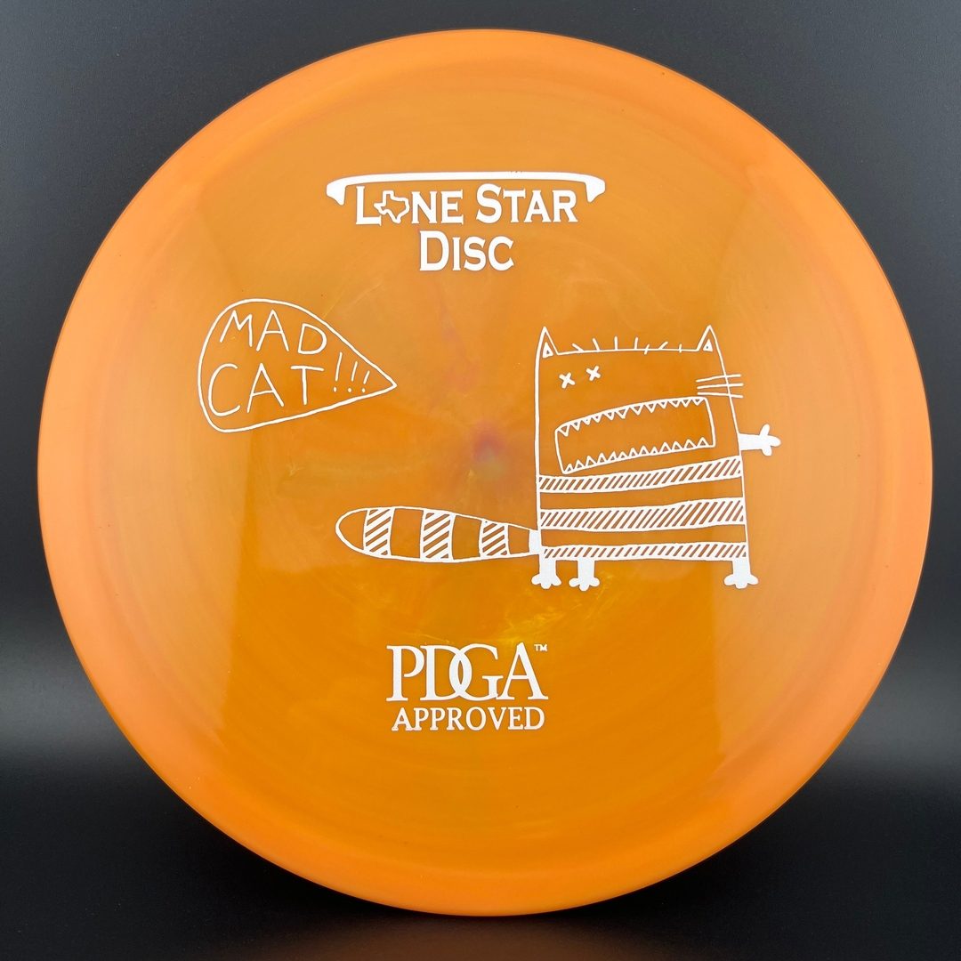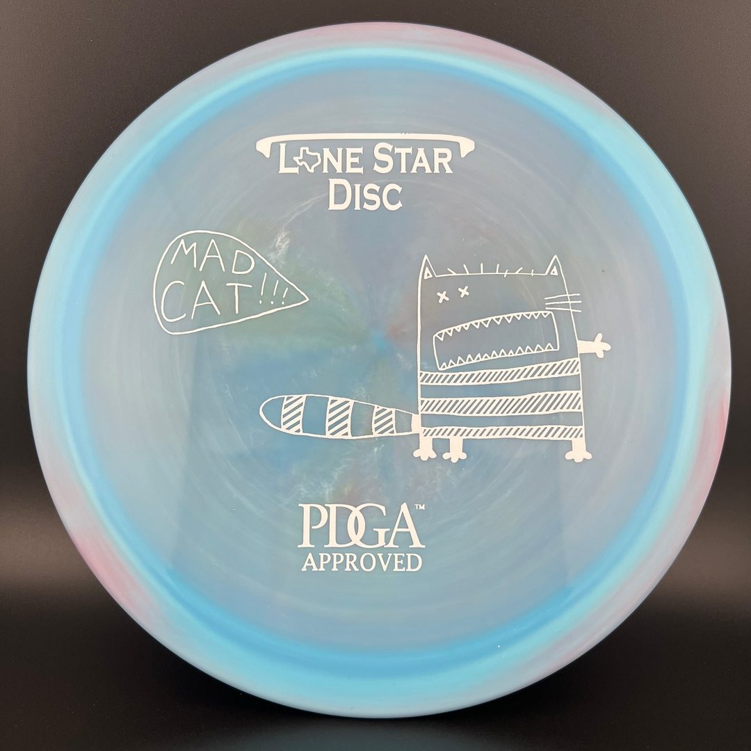 The Lone Star Mad Cat is a slightly overstable control driver for more experienced disc golfers. It has a slim, flat, profile that makes it great for forehand throws. It's reliable flight and great feeling plastic will make it your new favorite mold.