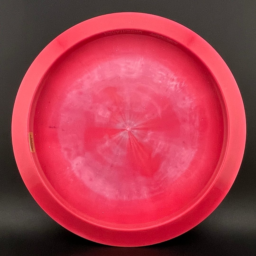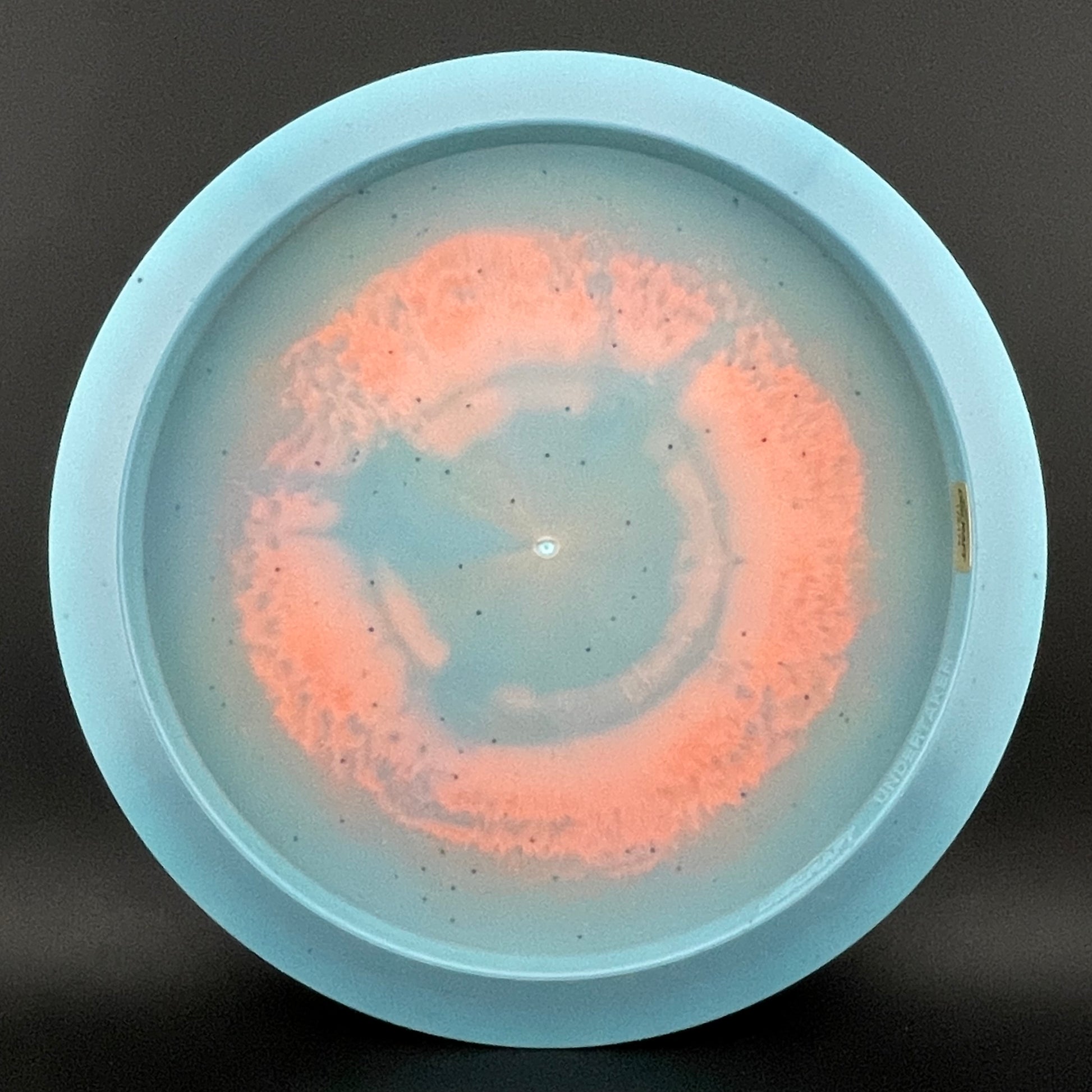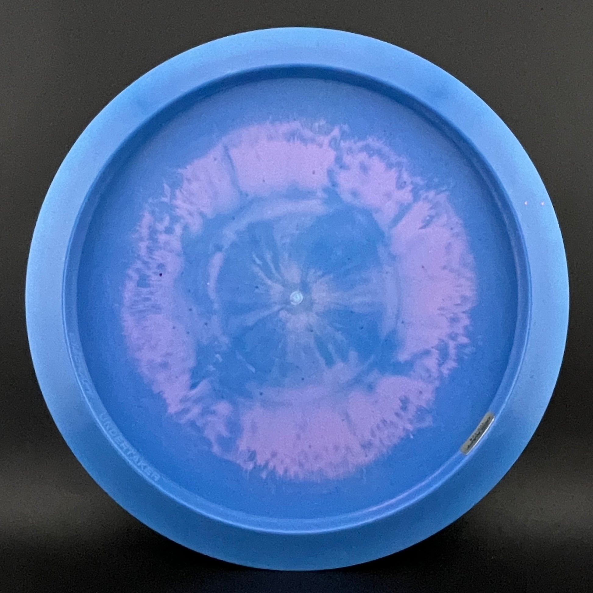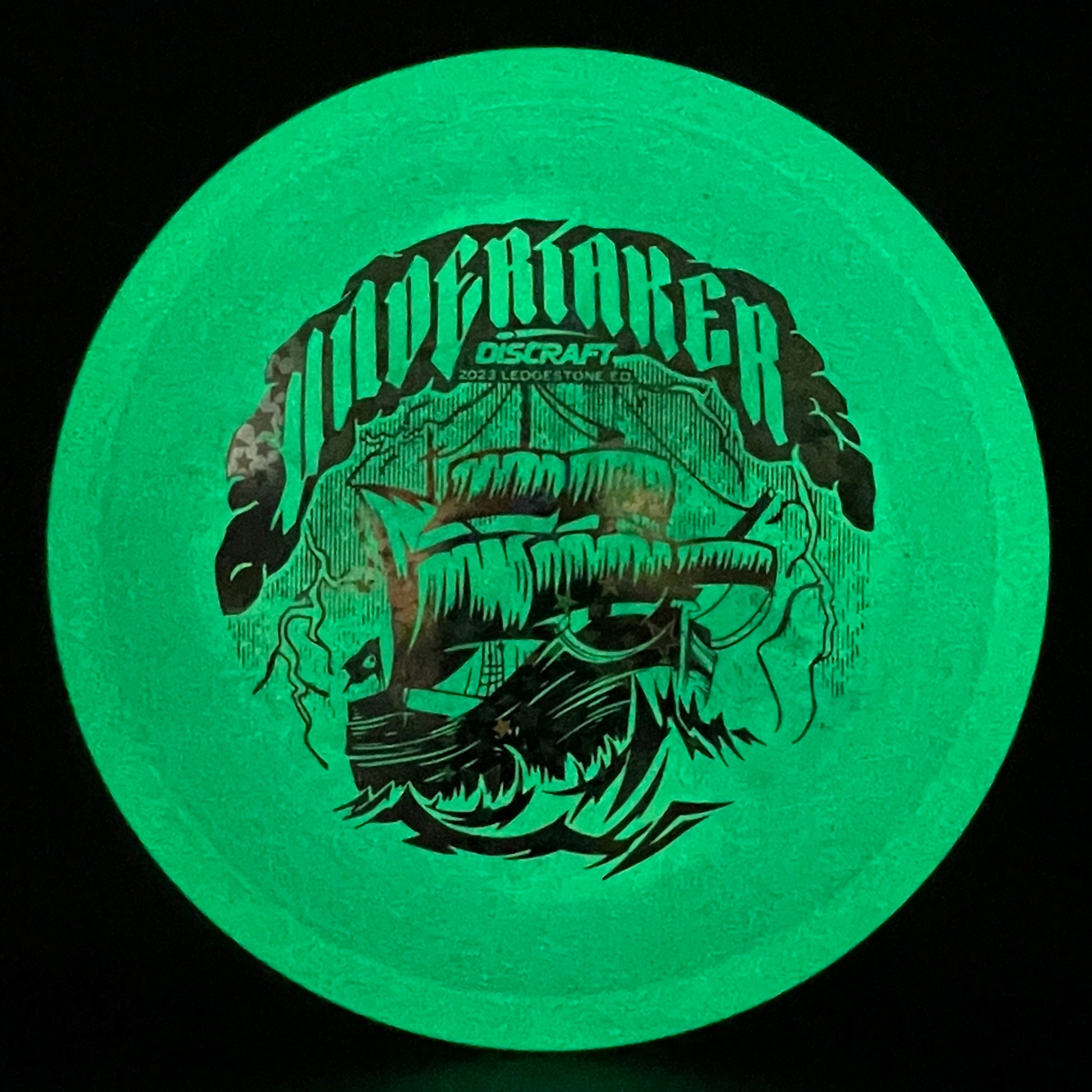 This fairway driver has a moderately overstable flight, but is great for battling the wind. It holds a hyzer line well, but can also be thrown flat to provide a high-speed turn before fading out with an overstable finish. It is popular for both forehand and backhand players with a comfortable rim grip. These Undertakers have a slight give in the hand and feel comfortable on release in the tackiness of the ESP plastic. The Glo portion makes this run vibrant at night but also maintains the consistent overstable fade at the tail end of flight. The stamp features “Undertaker” in the midst of a menacing storm cloud as lightning strikes, thunder claps, and a raging sea torments a brave seafaring vessel below. This was part of a run of 1500 discs
