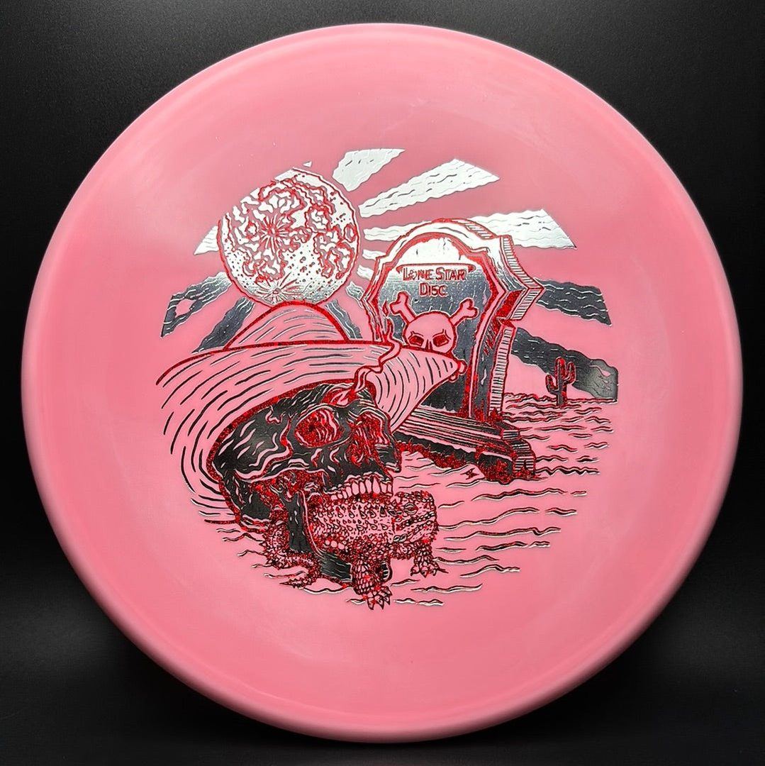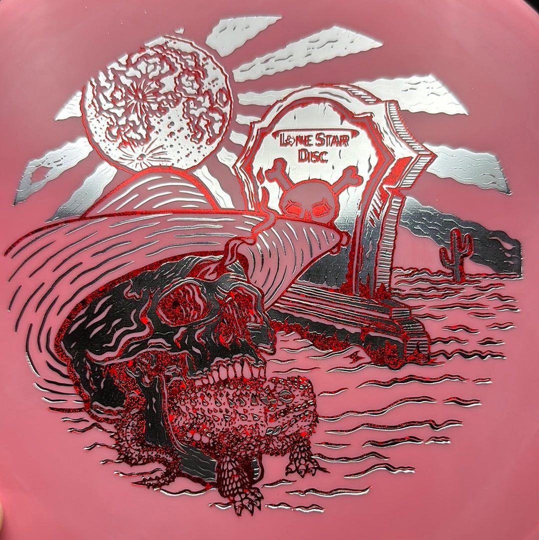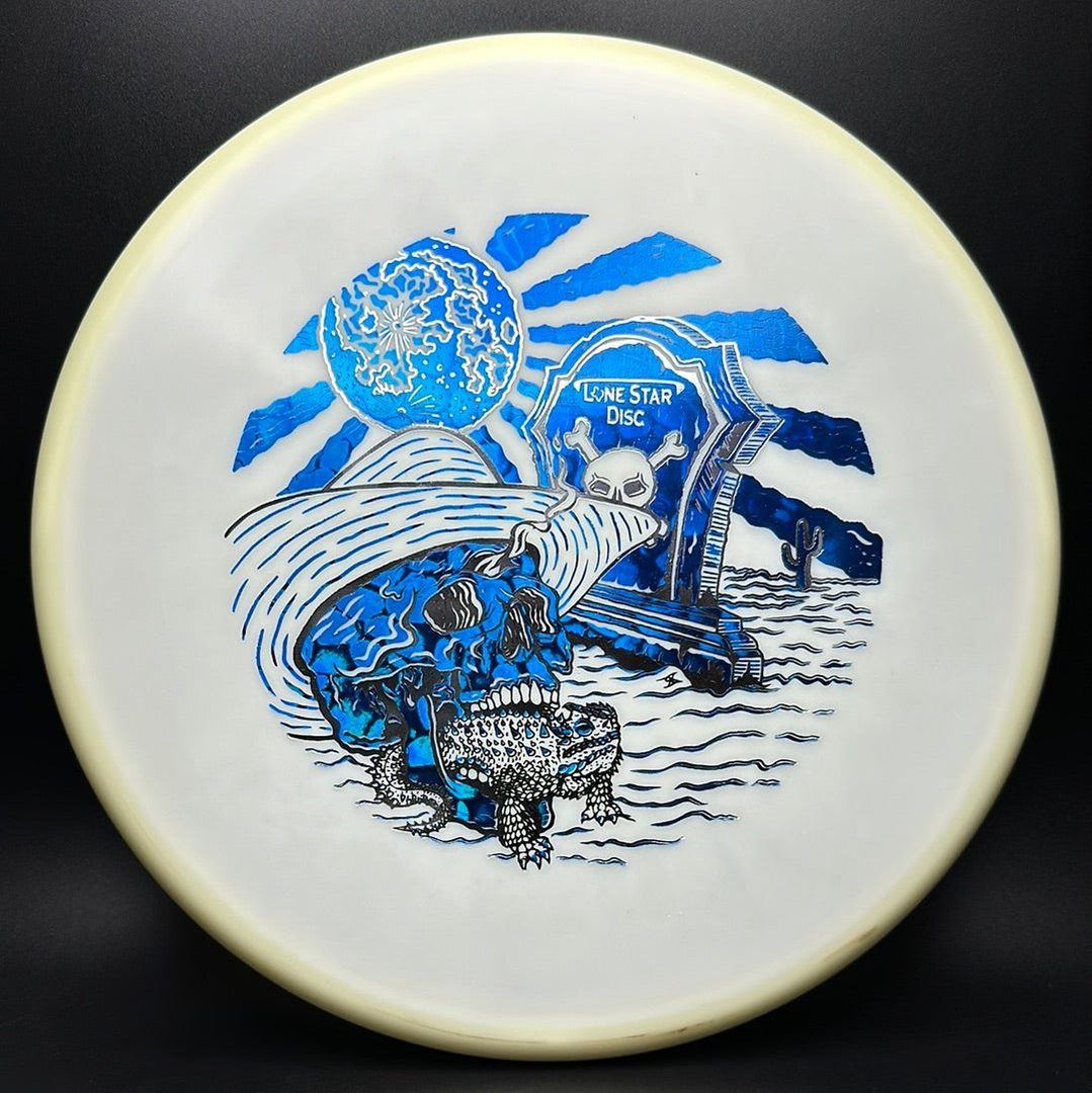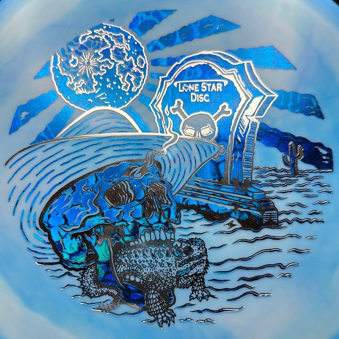 The Lone Star Disc Horny Toad is an overstable putter designed for precise upshots, offering excellent glide and consistent fade. It works well with both high-power backhands and forehands, even in toughest windy conditions.