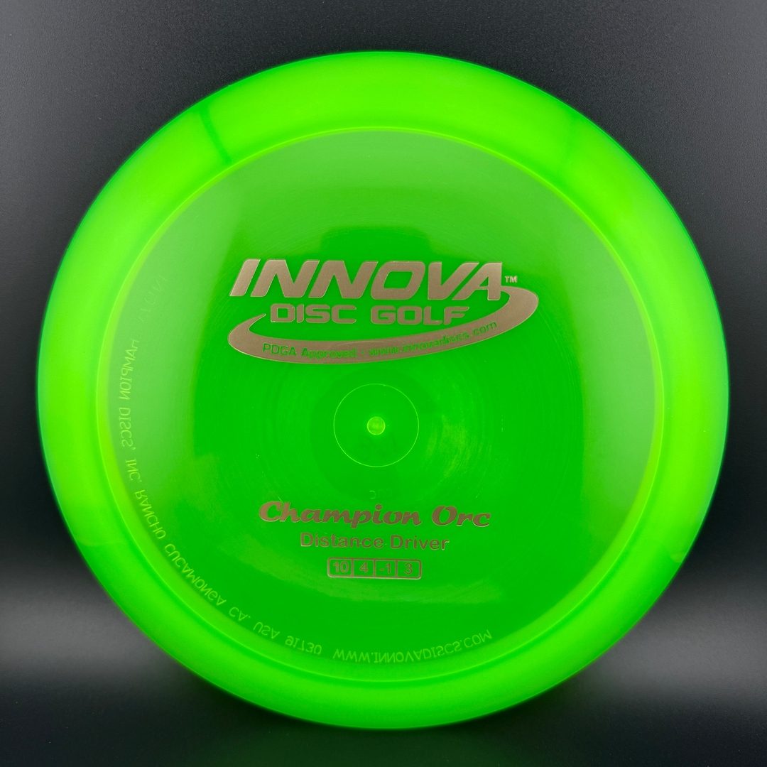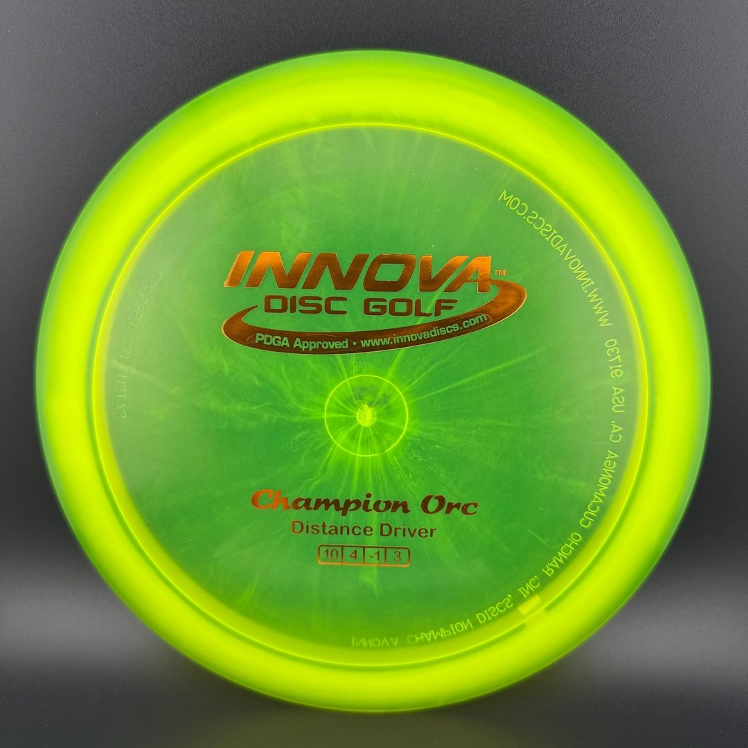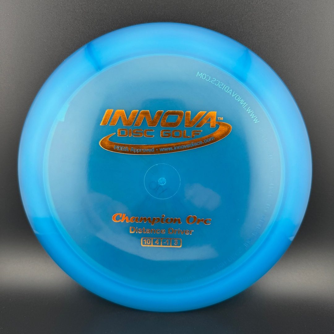 The Orc is a the classic Speed 10 driver made by Innova. This is a fast but accurate flying disc, good for intermediate players. The Orc flies well for both backhand and forehand throws. This is an overstable disc, but it has a degree of understable turn (-1) which gives it a nice flying S path. The Orc is taller than the average distance driver and has a thinner rim. In lighter weights, this disc is a good driver for newer disc golfers. The Orc is also a good beginner disc for new players who prefer forehand throws.