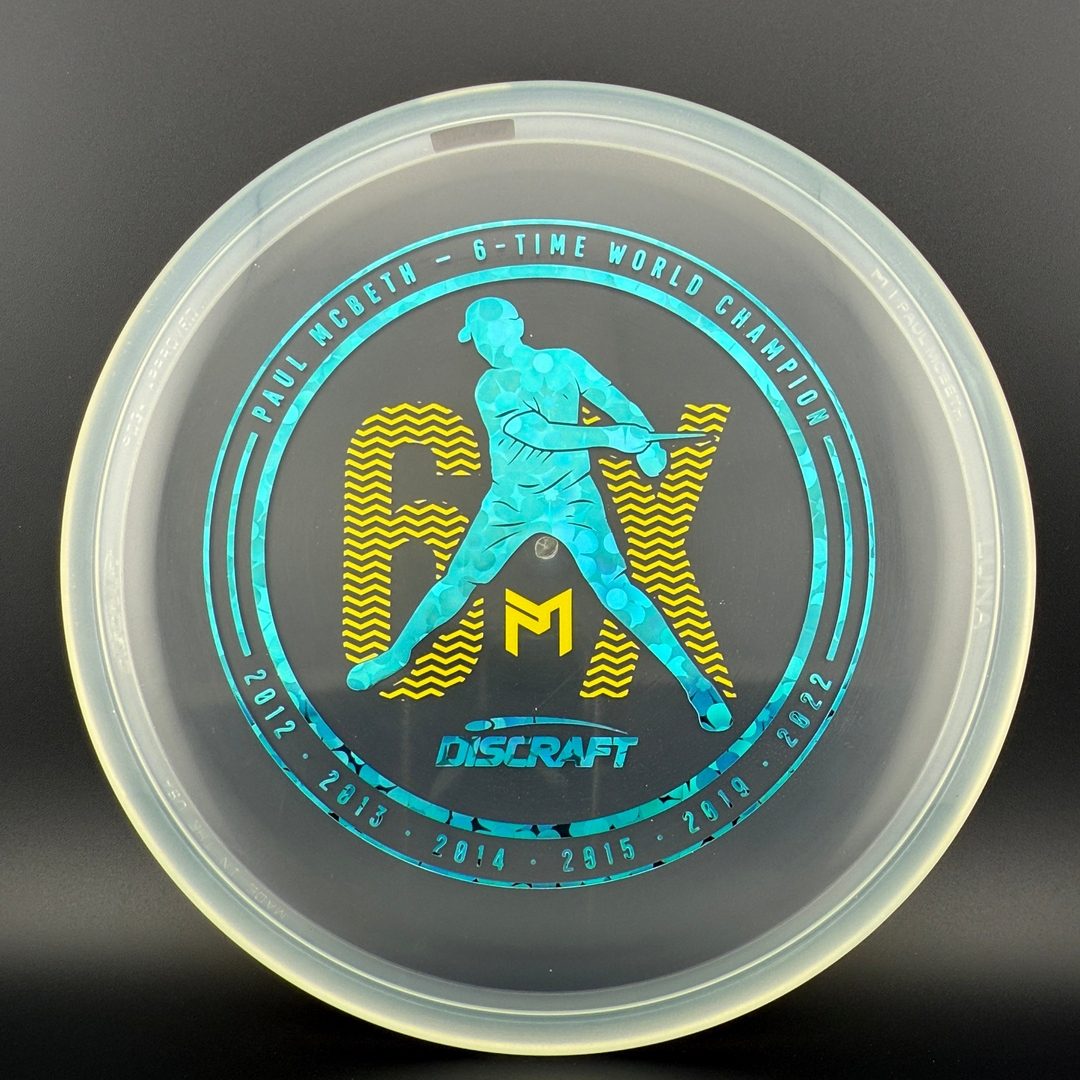 A limited CryZtal Luna's to celebrate Paul's 6th World Championship win. These rare 6X CryZtal Lunas are double stamped, top and bottom, to create a one-of-a-kind graphic truly fitting for Paul's 6th title. The iconic crystal clear plastic feels great in the hand while the combination of foils creates a piece of art that will be hard to let fly.