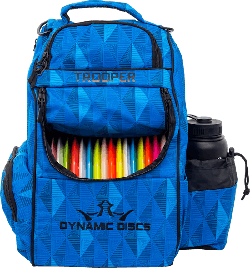 Whatever's on the itinerary, let the Trooper disc golf bag get you through it. The Trooper can hold 18+ discs in its main compartment. It also has an upper compartment that can hold anything from more discs to articles of clothing. Featuring three additional pockets, the Trooper can handle all accessories needed for a full disc golf round. One side of the pack features a drawstring-enclosed water bottle holder and valuables pocket above. On the other side, a larger side pocket is featured in addition to another valuables pocket above.