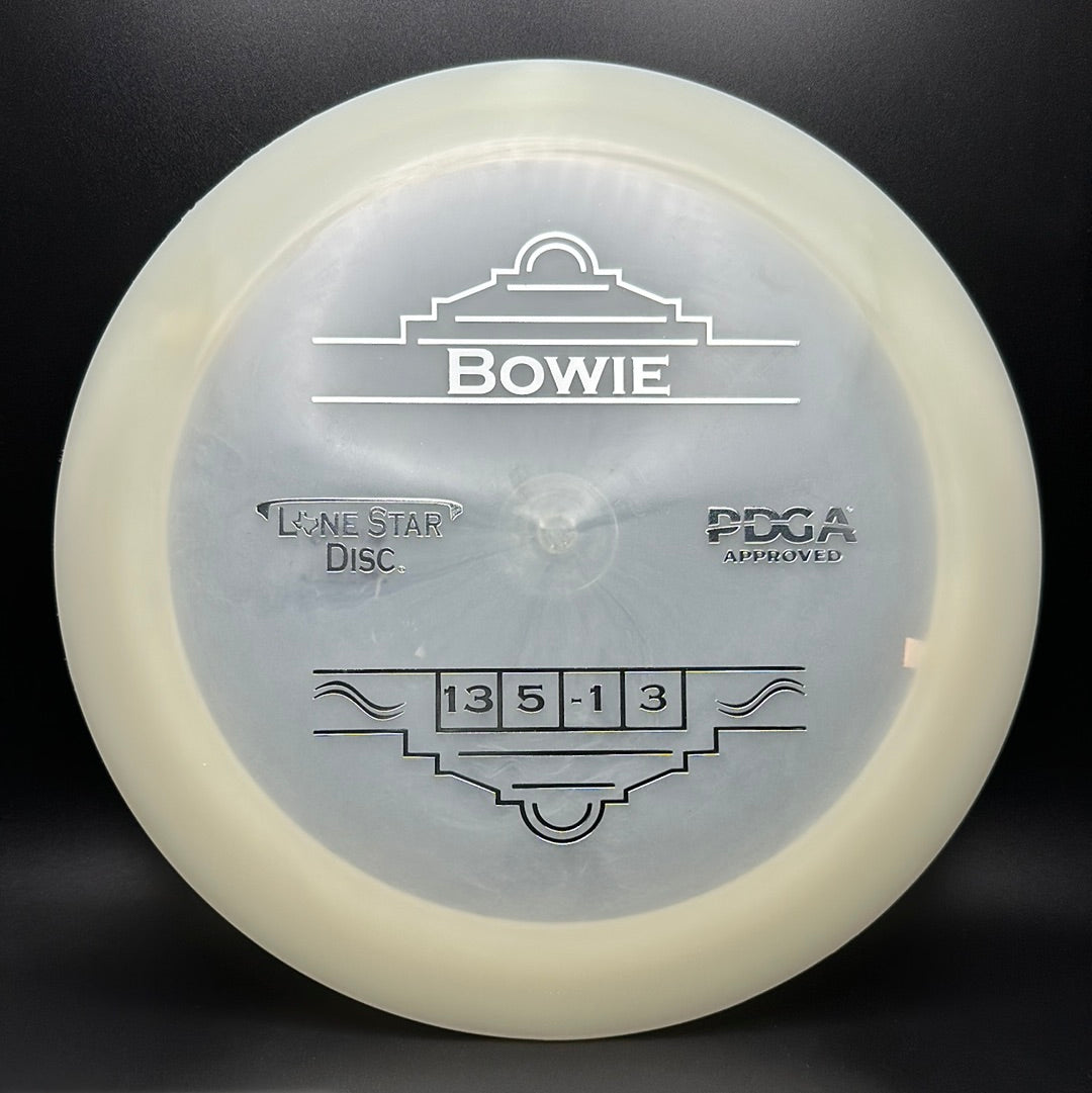 The Bowie is Lone Star's first distance driver. This is a fast overstable disc, designed to handle power. It will fly very straight with little to no turn and fade at the end. This is a great disc for power throwers, windy shots, forehand throws, and strategic doglegs.