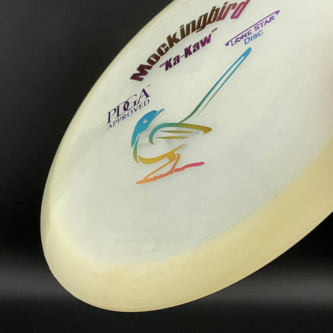 The Mockingbird (Ka Kaw!) is the perfect control driver for beginners and advanced players alike. It has the perfect straight to understable flight that everybody can make use of. It'll fly on any line you throw it on.