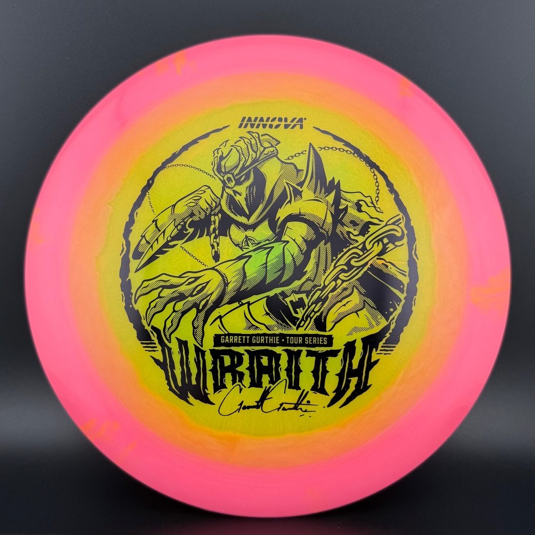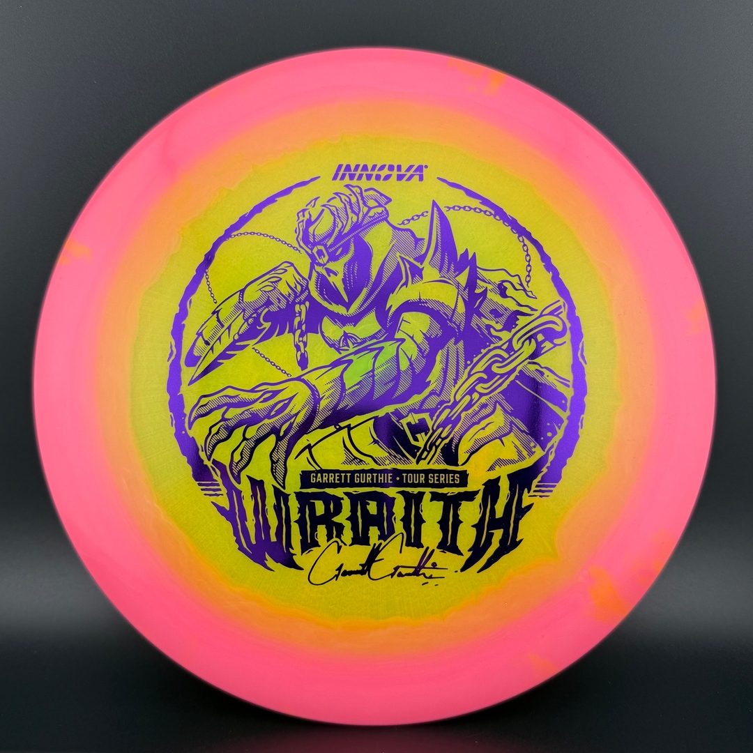 11/5/-1/3      *Beautiful halo CHAMPION run of Wraiths for Garrett Gurthie's 2024 Tour Series part 2! Insane swirls! All have chartreuse/neon green middle, color is the rim.  Very minor differences possible, multiple available.  Minor storage wear possible from manufacturer.