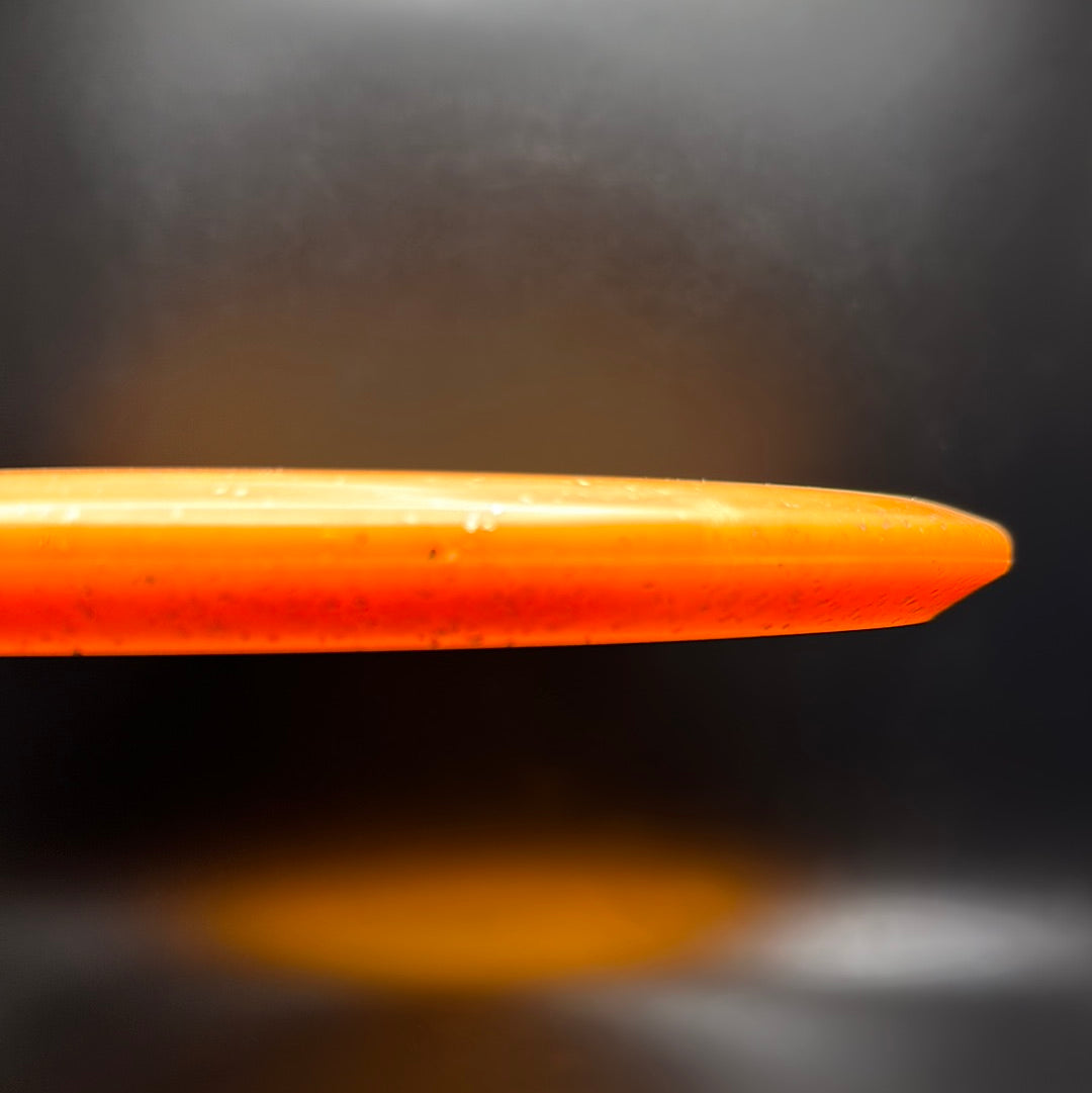 This is a Metal Flake glow-in-the-dark version of C-Blend plastic, which is the equivalent of Innova's Champion plastic. It is a semi-transparent, durable plastic that provides outstanding performance and long life. The Glow C-Blend can be either colored or traditional white glow and often feels slightly more gummy than typical C-Blend plastic.