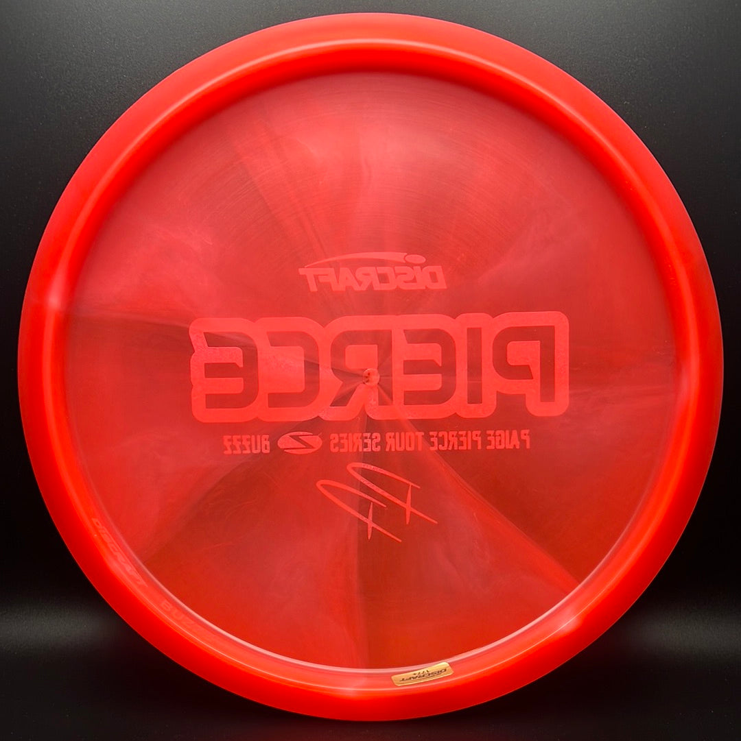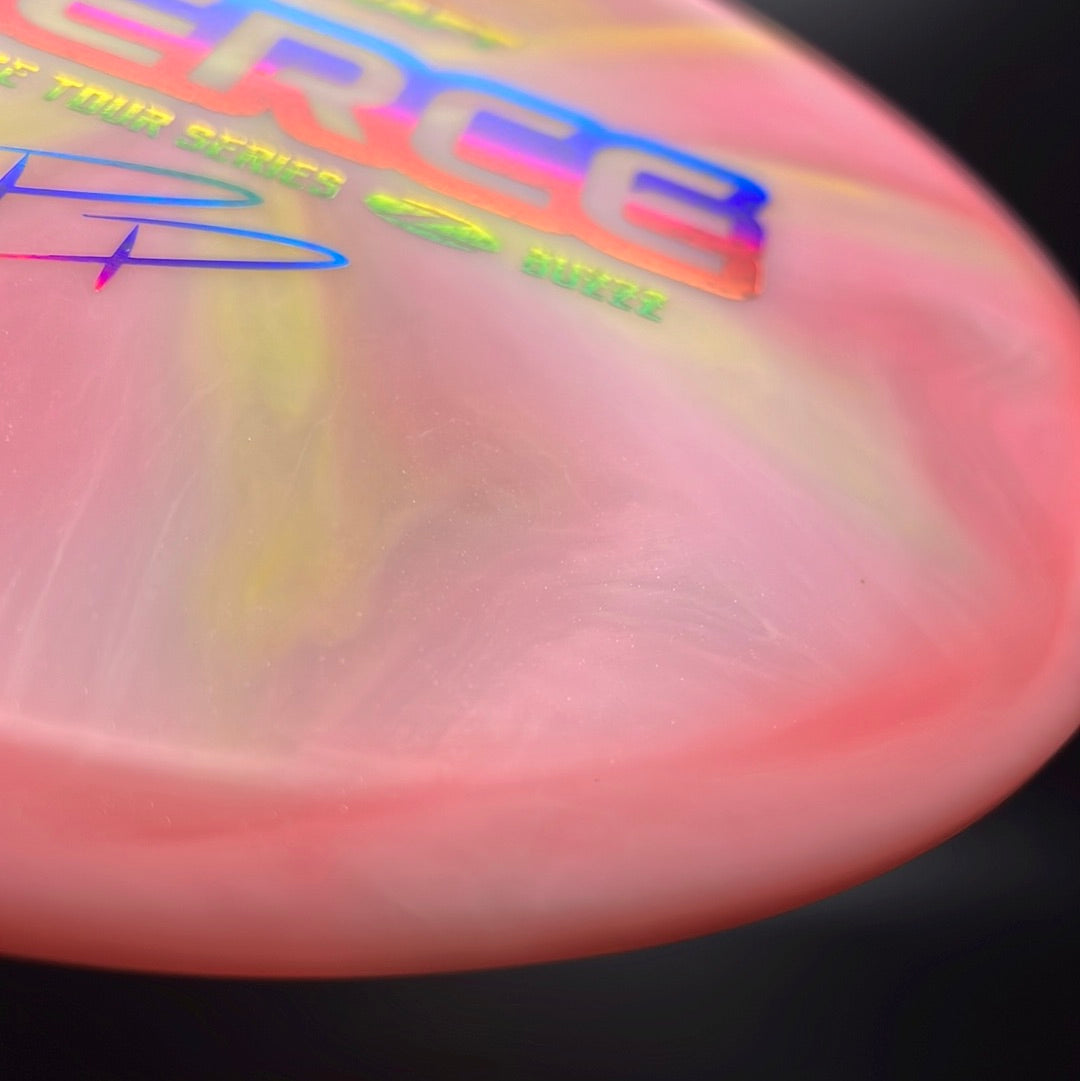 The Z Swirl Tour Series plastic brings its signature, translucent swirls to this run of the Buzzz. Expect this to be slightly more overstable than the standard Z run, but with added tackiness for grip. The Buzzz is the straightest midrange on the market and is the most popular disc in the world.